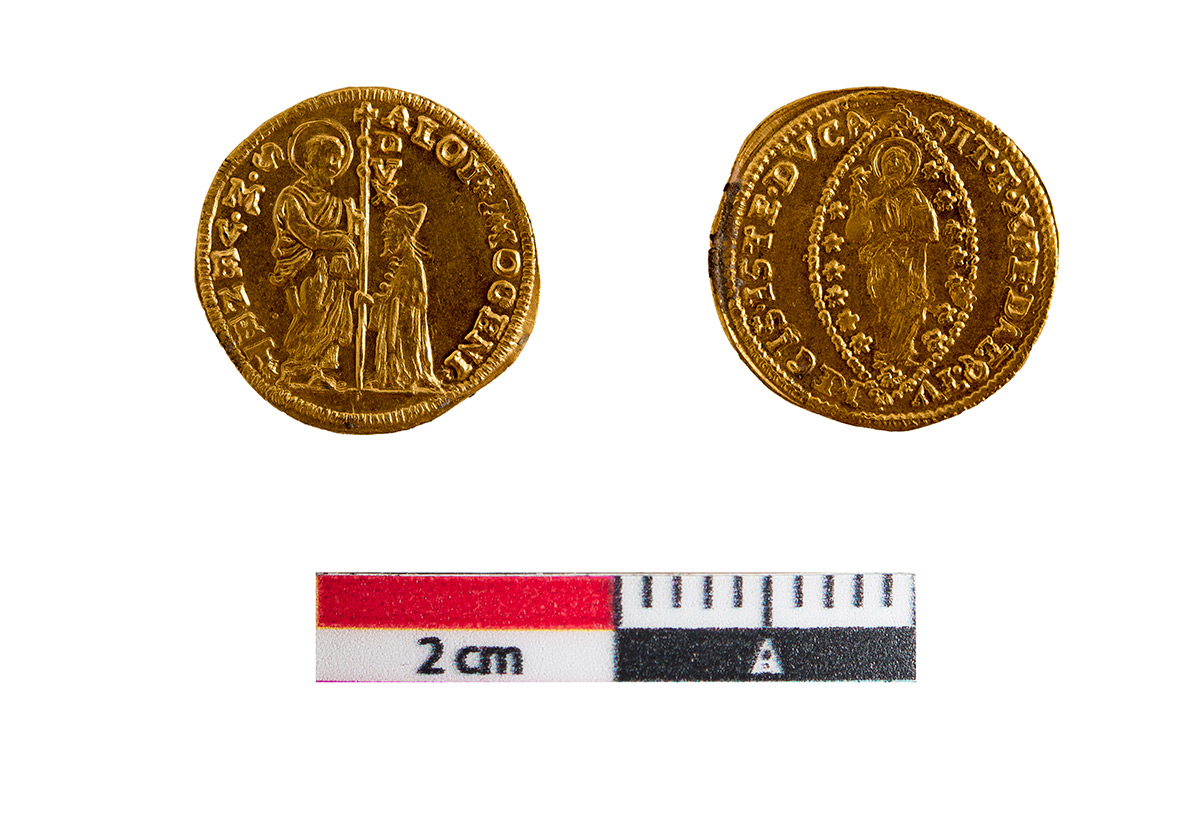Nalazi koji su nam rasvijetlili ovaj brodolom su nalazi novca, posebno zlatnog. Dosad su nađena tri zlatna venecijanska dukata. Najraniji je zlatni dukat dužda Francesca Morosinija (1688. – 1694.) s natpisom FRAN MAVROC DVX S M VENET (avers), SIT T XPE DAT Q TV REGIS ISTE DVCA (revers). Taj je dužd možda najpoznatiiji po svojoj ulozi u Morejskome ratu (1684. – 1699.) kad je topovskom paljbom raznio Akropolu u Ateni kojom se osmanska vojska koristila kao barutanom. Druga dva pripadaju početku 18. st., jedan s prikazom dužda Alvisea II. Moceniga (1700. – 1709.) s natpisom ALOY MOCENI S·M·VENET· (avers), SIT·T·XPE. DAT.Q.TV REGIS·ISTE·DVCA (revers), dok drugi prikazuje dužda Giovannija II. Cornara (1709. – 1722.), s natpisom IOAN CORNEL· S·M·VENET· (avers), SIT·T·XPE·DAT·Q·TV REGIS·ISTE·DVCA (revers).