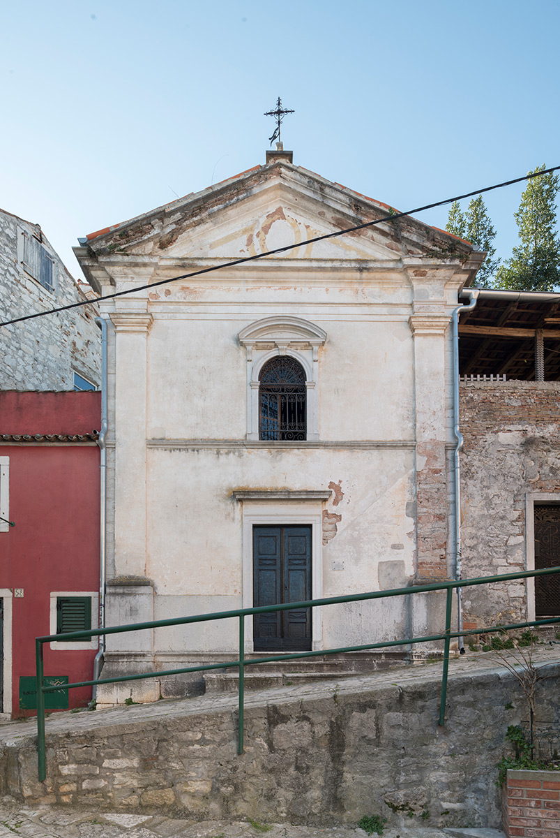 Crkvu je projektirao i gradio Simon Battistella (1726. – 1799.), jedan od najvažnijih istarskih arhitekata druge polovice 18. stoljeća. Poznavanje venecijanskih kasnopaladijevskih i barokno-klasicističkih koncepata te rada najuglednijih predstavnika, kao što su Giorgio Massari i Antonio Gaspari, očituje se u prostornom rješenju crkve dvoranskog tipa sa zaobljenim kutovima, s klasicističkim elementima profiliranih razdjelnih vijenaca i plitkih toskanskih pilastara te bogato osvijetljenih, gotovo monokromnih zidnih ploha. U interijeru se, već svojim kolorizmom, ističu oltar izveden u kombinaciji bijelog i crvenog mramora i sivog kamena te strop lađe sa slikanim prizorima u profiliranim okvirima i geometrijsko-vegetabilnim dekoracijama izvedenim u štuku, čije porijeklo treba tražiti u vokabularu rokokoa. Na sjevernoj strani nalazi se drveno pjevalište s vjetrobranom u prizemlju, do kojega se uspinje kamenim stubištem s istočne strane. Na južnoj strani, iza oltarne niše nalazi se mala sakristija. Kamena podnica crkve je povišena zbog grobnica. Klasicistički plošno koncipirano pročelje raščlanjeno je rubnim pilastrima, etaža pjevališta je istaknuta skromnim razdjelnim vijencem i velikim, bogato klesanim prozorom, a pjevalište je zaključeno timpanonom, čija je središnja ploha ukrašena slikanim dvobojnim geometrijskim motivom, sa središnjim medaljonom flankiranim polegnutim trokutima.