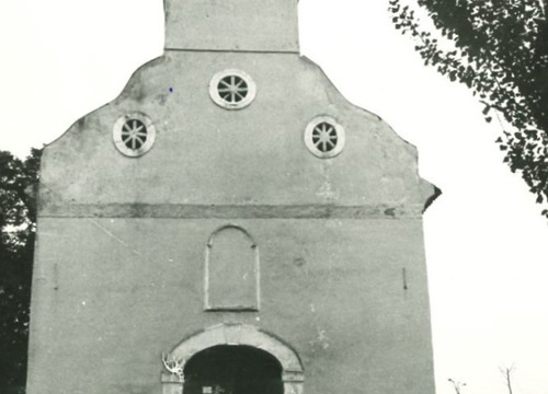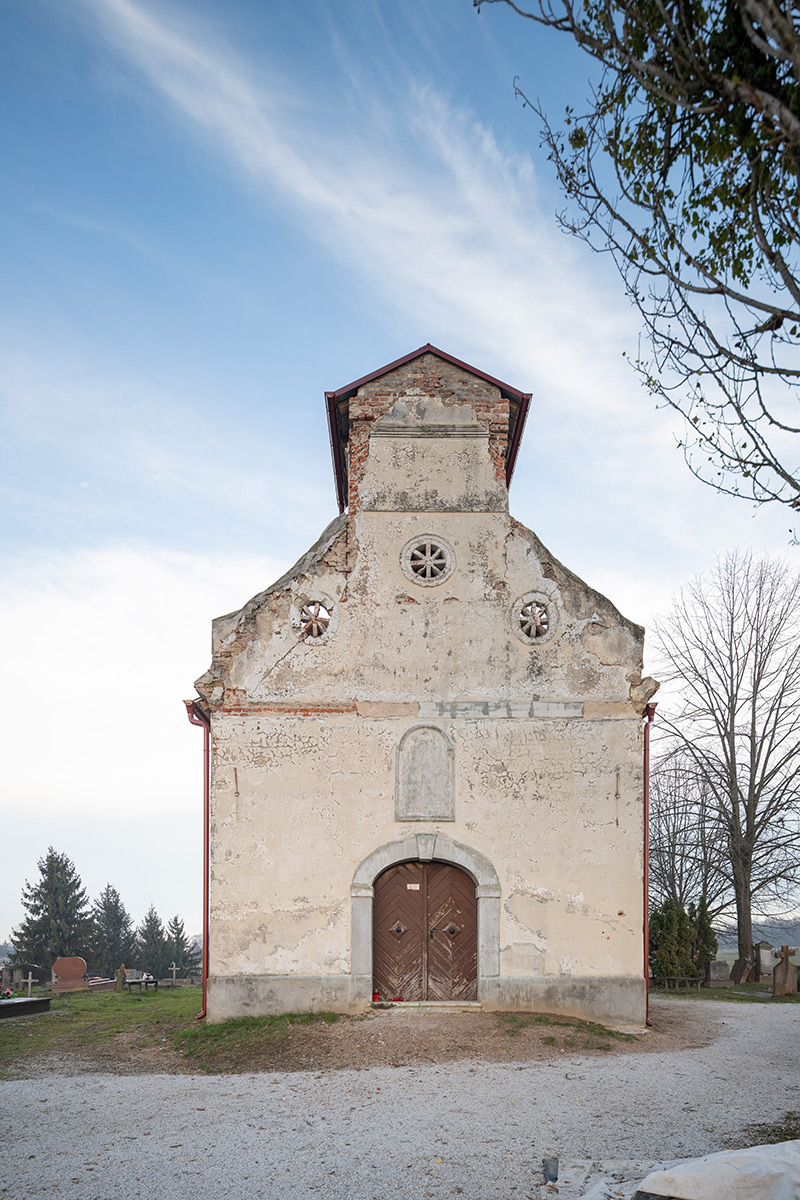 U središnjoj osi zapadnog pročelja je glavni ulaz, a jednostavna traka razdjelnog vijenca označava zonu zabata čiji se bočni zidovi spuštaju od zvonika u valovitim linijama. Zabatna je zona ukrašena trima malim, nepravilnim, trokutasto raspoređenim okulusima, čiji svijetli otvor ispunjavaju radijalno složene opeke formirajući rozete. Zvonik je bio zaključen visokom, uskom kapom s limenim pokrovom, a u vrhu je, na sve četiri strane, bio rastvoren pravokutnim, lučno zaključenim otvorima. Zvonik se urušio tijekom petrinjskoga potresa 29. prosinca 2020. godine, oštetivši zapadni dio krova lađe.