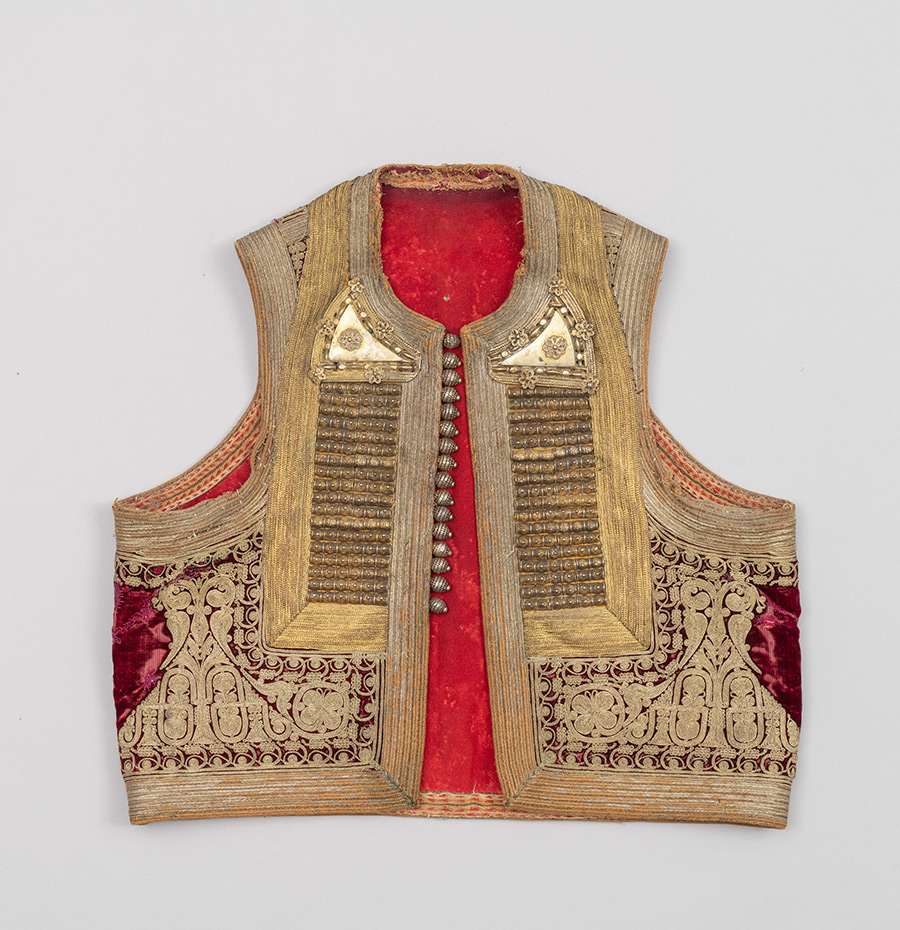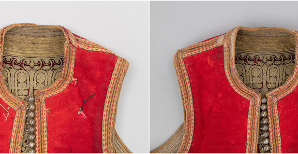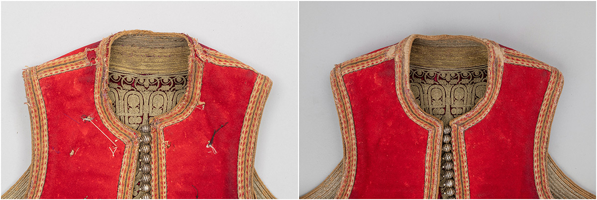 U 2023. godini za dva muška prsluka (DUM EM 3657 i 4799) izrađena je fotografska, grafička i pisana dokumentacija zatečenog stanja. Konzervatorsko-restauratorski radovi obuhvatili su uzorkovanje tekstilnih i metalnih niti za kvalitativnu analizu, suhi postupak čišćenja te djelomično odvajanje dijelova predmeta. Nabavljene su nove tkanine za podlaganje oštećenja. Na oba prsluka sanirana su mjesta oštećenja na podstavnim tkaninama i tkanim trakama. U 2024. godini nastavljeni su konzervatorsko-restauratorski radovi, a za sanaciju mjesta oštećenja šivanjem na novim je tkaninama postignut odgovarajući ton obojenja. Izvedena je sanacija oštećenja glavnih tkanina, terzijskog veza, ukrasnih galun traka i tkanih traka šivanjem kombiniranim restauratorskim bodovima. Očišćeni su metalni dijelovi te je izrađena fotografska i pisana dokumentacija tijekom radova. Nabavljene su kutije od beskiselinskog kartona za pohranu i transport.