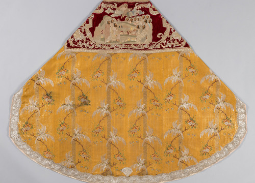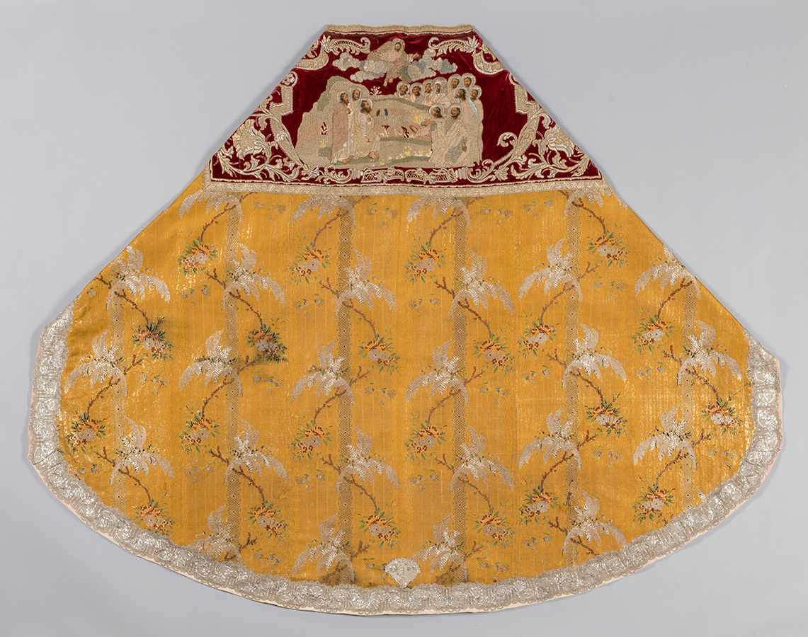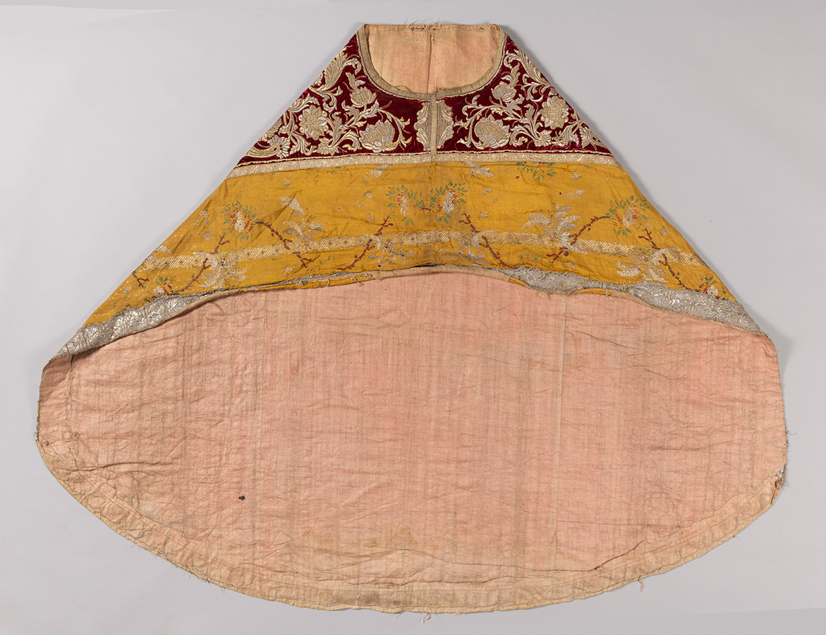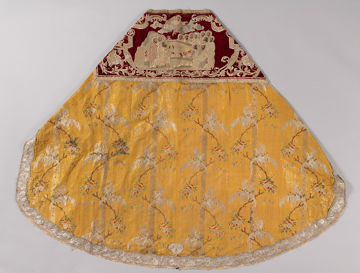 Temeljna tkanina felona je zlatnožuti lamirani i broširani lampas na koji je na dijelu oplećja prišiven vezeni umetak purpurnoga svilenog baršuna. Broché potke temeljne tkanine tvore motive karakteristične za navedeno razdoblje, a riječ je o okomitim trakama s cvjetićima preko kojih se uvijaju tanke grančice s dvije vrste cvjetnih buketića. Na baršunu oplećja je tehnikama sviloveza i zlatoveza preko podloge izrađen prikaz Uzašlog Krista u trenutku ukazanja Bogorodici i apostolima. Glavni prikaz okružen je motivima traka, grana i cvjetova. Posebna je pozornost posvećena oblikovanju okoliša vezenih figura upotrebom različitih posrebrenih, pozlaćenih, frisé i raznobojnih svilenih niti. Inkarnat figura oslikan je uljanim bojama na svilenom ripsu te podložen tanjim kartonom. Vezeni baršun ima međupodstavu od lanenog platna. Na felonu su zatečene četiri vrste metalnih traka prišivene uz vratni izrez, na dnu oplećja i na donjem rubu felona, a od posljednje je izrađen mali romb na dnu stražnjeg dijela. Okrugli dio vratnog izreza zarubljen je pozlaćenom uvijenom uzicom. Felon je podstavljen blijedoružičastim lanenim platnom s bijelom pamučnom kepernom vrpcom za vezanje.