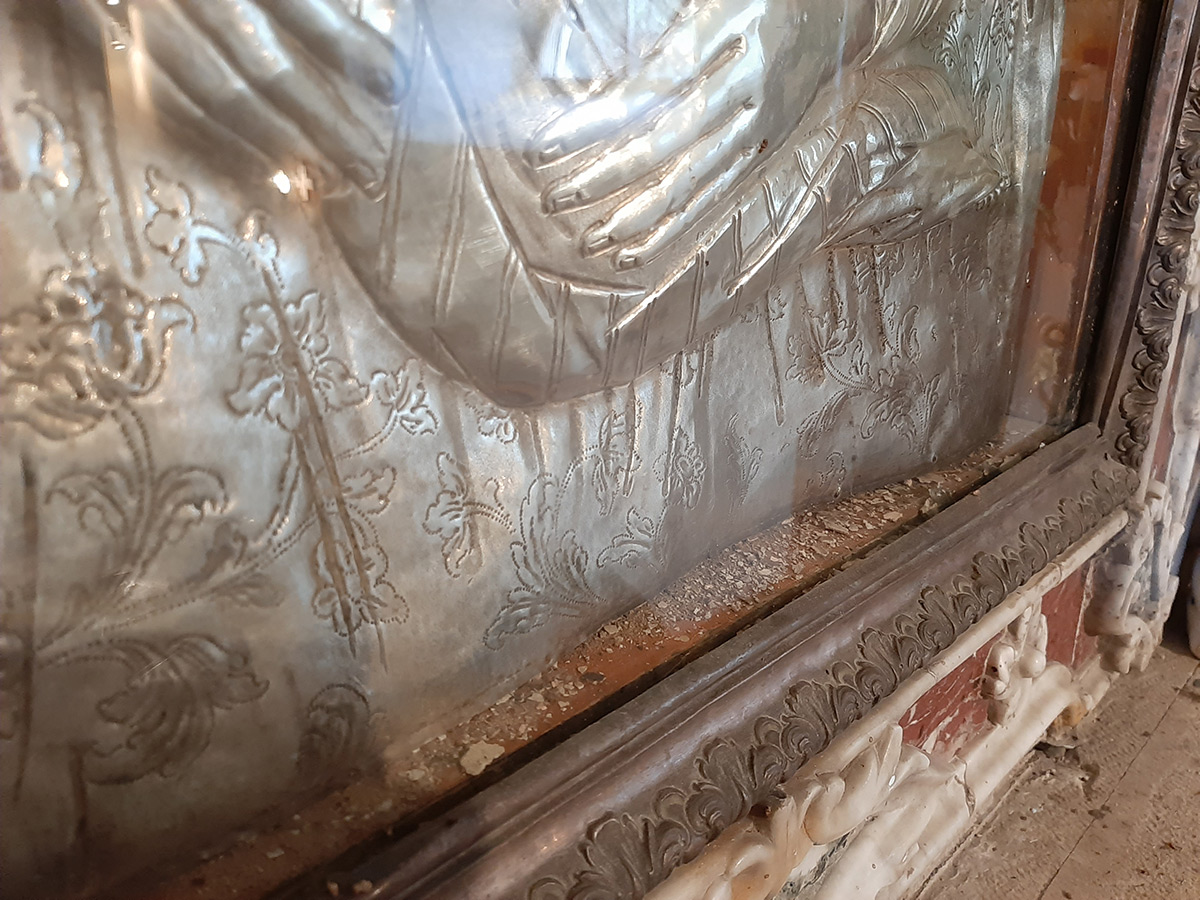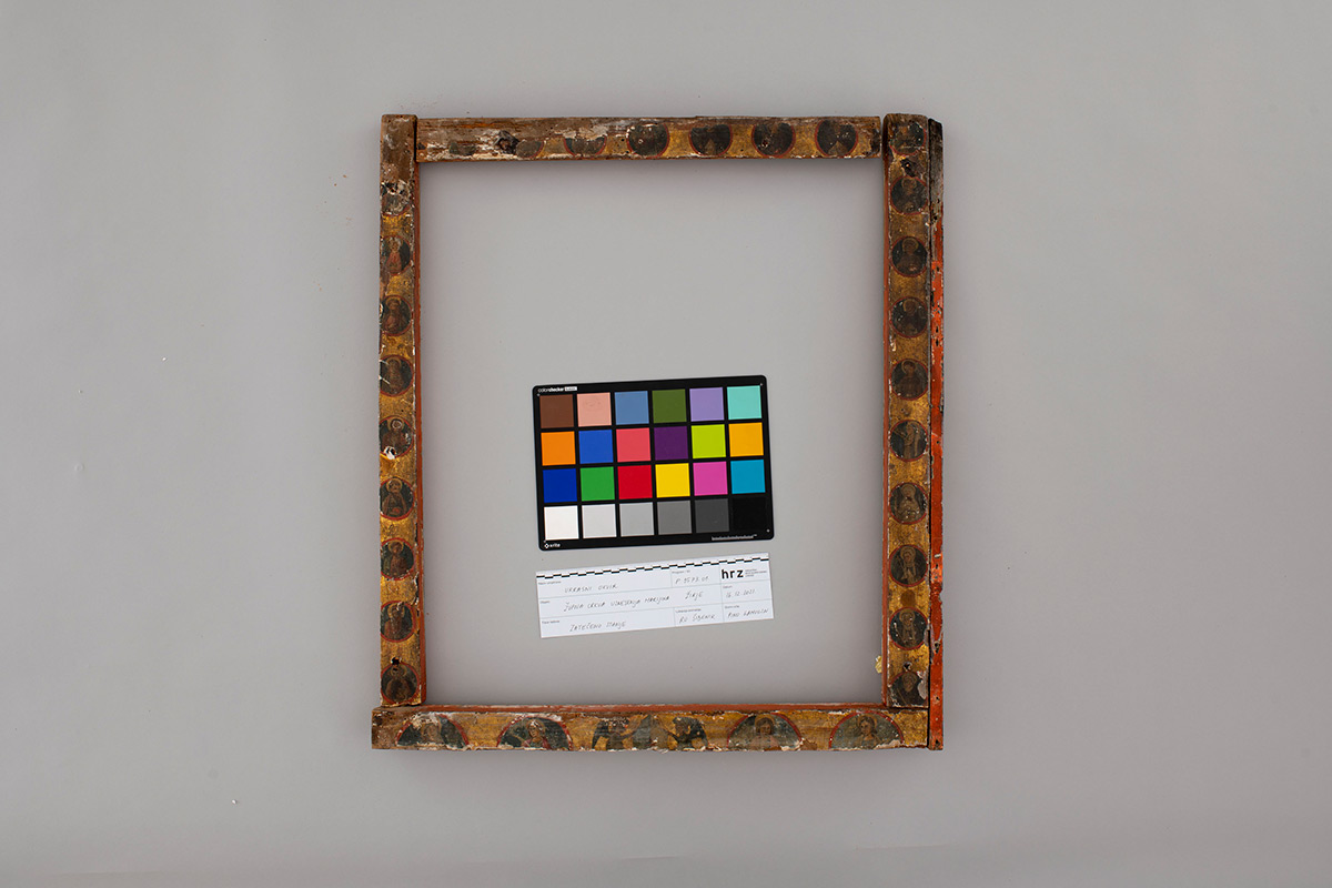 Okvir je, u odnosu na ikonu, bio u stabilnijem stanju, unatoč nedostajućim dijelovima slikanog sloja, no zbog smještaja unutar niše uopće nije bio vidljiv. Prema tragovima rezanja donje letvice moglo se zaključiti da izvorni smještaj tih dviju umjetnina nije bio u zatečenoj niši. Na okviru je proveden dio istraživanja; možda je najzanimljiviji rezultat to što se kao tkanina za izolaciju slikanog sloja od čavli koristila svilena tkanina. Imajući u vidu da su se za takve svrhe obično upotrebljavali ostaci jeftinijih tkanina, taj podatak postaje zanimljiv u kontekstu sagledavanja povijesti svilarstva i putova svile u našem podneblju. Na okviru je do sada proveden dio kemijskih ispitivanja i identifikacija drva. Nakon povratka umjetnine s fumigacije, kojoj je bila podvrgnuta zbog infestacije aktivnim insektima, istraživački radovi će se nastaviti.