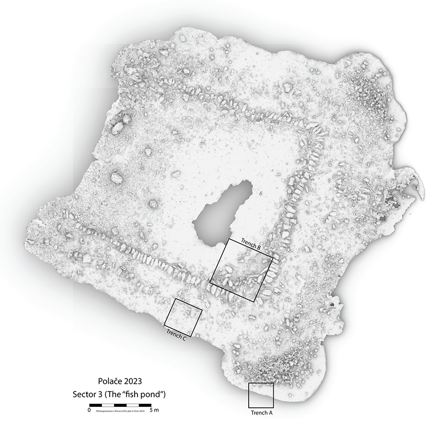 Sektor 3 nalazi se tridesetak metara sjeverozapadno od pristaništa. Riječ je o ribnjaku dimenzija 20 x 20 m koji se danas nalazi na dubini od dva metra. Jasno je vidljiv unutarnji zid ribnjaka koji je činio bazen; površinski je vidljiv i vanjski zid koji je s morske strane bio pojačan nasipanim krupnim kamenom. U sektoru 3 iskopane su tri arheološke sonde. Sonda A postavljena je s vanjske strane ribnjaka na južnom uglu. Dimenzija je 2 x 2 m, a iskopana je na 80 cm dubine. Sonde B i C postavljene su unutar ribnjaka kako bi se dokumentirao način gradnje. Sonda B, dimenzija 4 x 4 m, postavljena je uz unutarnji zid, a iskopana je do dubine od jednog metra, s vidljivih pet redova kamenih blokova postavljenih na kamen živac. Sonda C, dimenzija 3 x 3 m, postavljena je uz vanjski zid ribnjaka, a iskopana je do dubine od jednog metra.