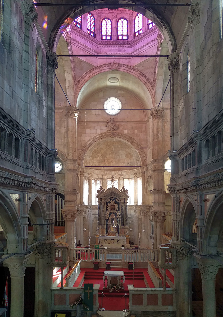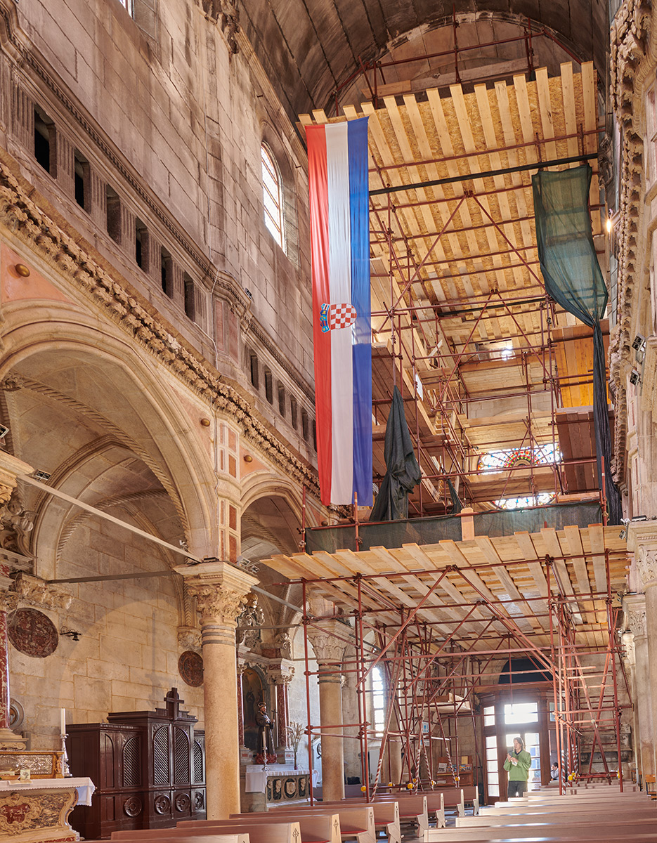 Potkraj 2012. godine, u prezbiteriju i glavnoj apsidi katedrale, Hrvatski restauratorski zavod proveo je istraživačke i probne konzervatorsko-restauratorske radove radi procjene cjelokupnog stanja kamenog oplošja apside. To je poslužilo kao podloga cjelovitim konzervatorsko-restauratorskim radovima koji su počeli 2013. godine u unutrašnjosti centralne apside. Početni zahvati odnosili su se na čišćenje zidne plohe unutrašnjosti katedrale, ali su pristup i metodologija od početka radova obuhvaćali svu širinu konzervatorsko-restauratorske problematike. U svrhu boljeg razumijevanja postojećega stanja materijala, uzroka propadanja i utvrđivanja njegove izvornosti i kontrole uspješnosti konzervatorsko-restauratorskih metoda, provedena su dijagnostička mjerenja i ispitivanja.