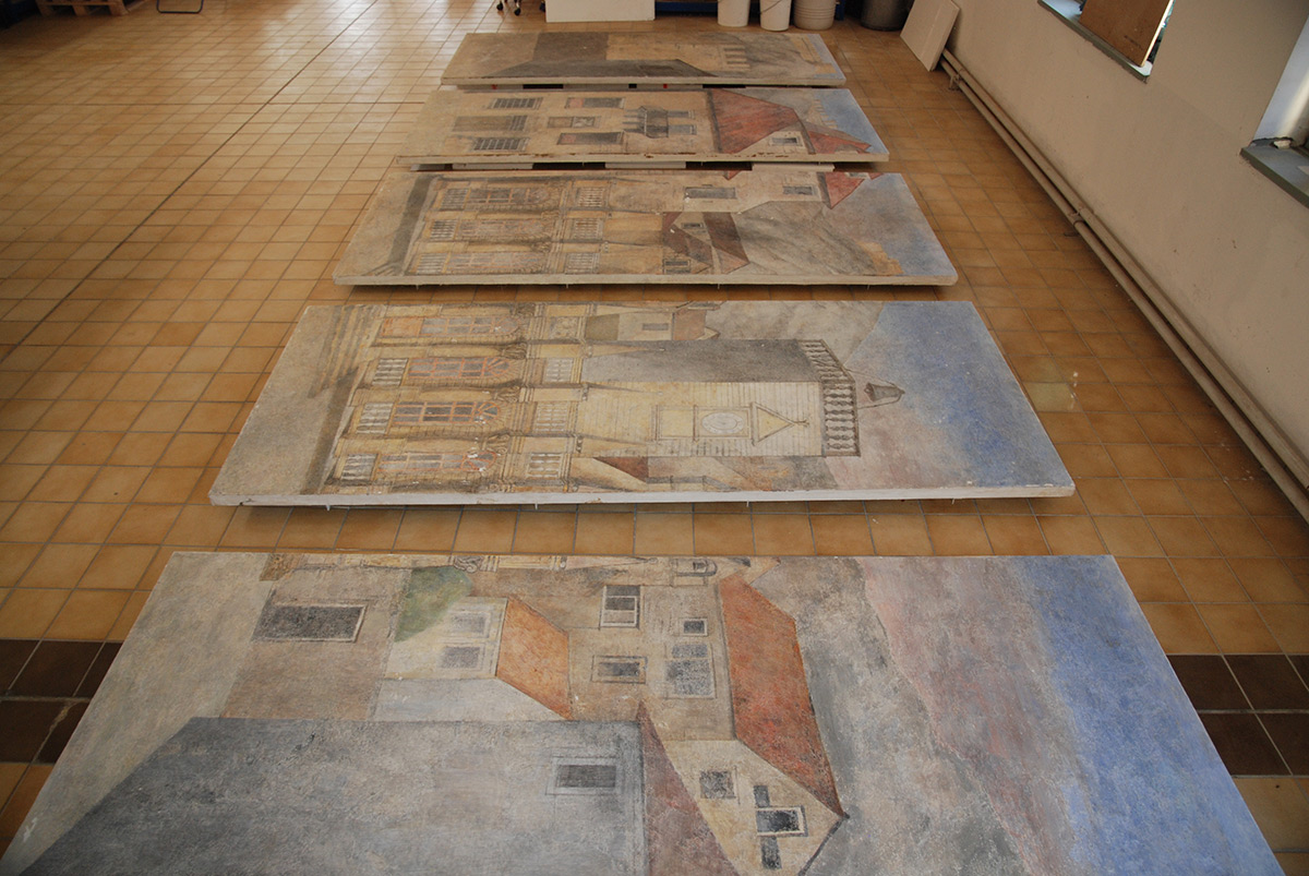 Tijekom konzervatorsko-restauratorskih radova koje je 1989. godine izveo Restauratorski zavod Hrvatske, na istočnom zidu pozornice otkrivena je starija zidna slika koju je pri obnovi kazališta za karnevalske svečanosti 1819. godine naslikao Petar Galasso. Zbog prezentacije obiju zidnih slika, koje predstavljaju scenografsku dekoraciju pozornice, novija zidna slika odvojena je od zidne površine i premještena na prijenosnu podlogu u pet odsječaka.