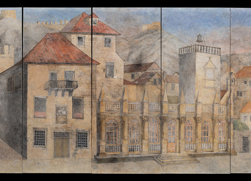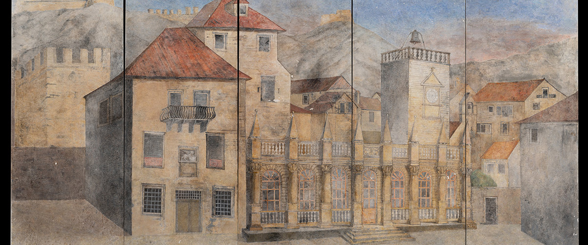 Zidna slika s prikazom vedute grada Hvara, na kojoj su prikazane Kneževa palača, Vijećnica, gradska loža i sat-kula, izvorno je krasila zid na začelju pozornice Hvarskog kazališta, čineći njezinu stalnu scenografiju. Naslikao ju je 1900. godine Nicolo Marchi.