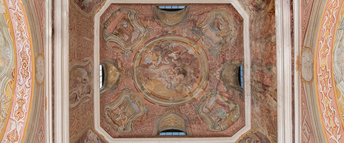 Svodovi svetišta i kapela, zid tambura i kupola prekriveni su zidnim oslicima koji su, prema natpisu u kartuši u kupoli, naslikani 1726. godine. Ikonografski program obuhvaća scene iz Starog i Novog zavjeta smještene u kartuše, dok je prostor između njih ispunjen dekorativnom ornamentikom. Središnji prikaz na kupoli je Presveto Trojstvo ili Apoteoza, a na svodu su naslikane scene Anđeo tješi Krista u Getsemanskom vrtu, Bičevanje Krista, Krunjenje trnovom krunom, Izrugivanje Krista, Isus pada pod križem, Krista pribijaju na križ, Golgota i Polaganje u grob. Zid tambura oslikan je prikazima Mjedena zmija, Mojsije izbija vodu iz pećine, David daje odsjeći glavu glasonoši o smrti kralja Saula i Izraelski kralj naređuje da ubiju proroka Elizeja. Ti su izvorni oslici s vremenom oštećeni te su obnovljeni potkraj 19. stoljeća.