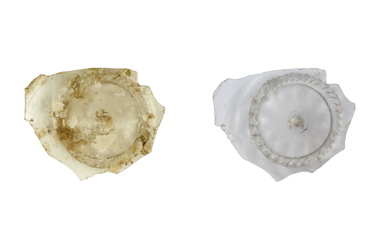 Stakleni predmeti također su pažljivo mehanički očišćeni. Najvažnije je bilo uklanjanje obraštajnih organizama i naslaga kalcifikata, da bi predmeti bili u stanju što bližem izvornom. Kao i za predmete od bronce i željeza, cijeli proces restauracije staklenih predmeta detaljno je fotografski dokumentiran.