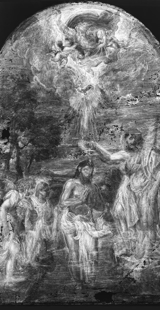 Konzervatorsko-restauratorskim istraživanjima obuhvaćena su snimanja tehnikama ultraljubičaste fluorescencije i infracrvene reflektografije, rendgenske radiografije, stratigrafske analize mikropresjeka te rendgenske fluorescentne spektroskopije (XRF). Rendgenska radiografija otkrila je prisutnost dvaju preslika. Stariji preslik bio je precizno izveden i uvelike je slijedio izvorn prikaz, s ponešto pojednostavnjenim detaljima, dok je kasnija intervencija bila slabije likovne kvalitete. Radiografske snimke potvrdile su da se ispod preslika nalazi dobro očuvan izvorni slikani sloj, osobito u prikazu anđela, pejzaža i arhitekture u pozadini.