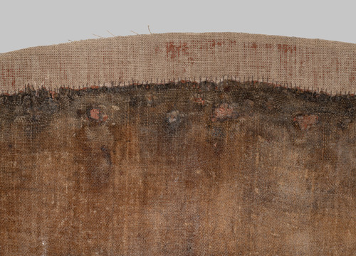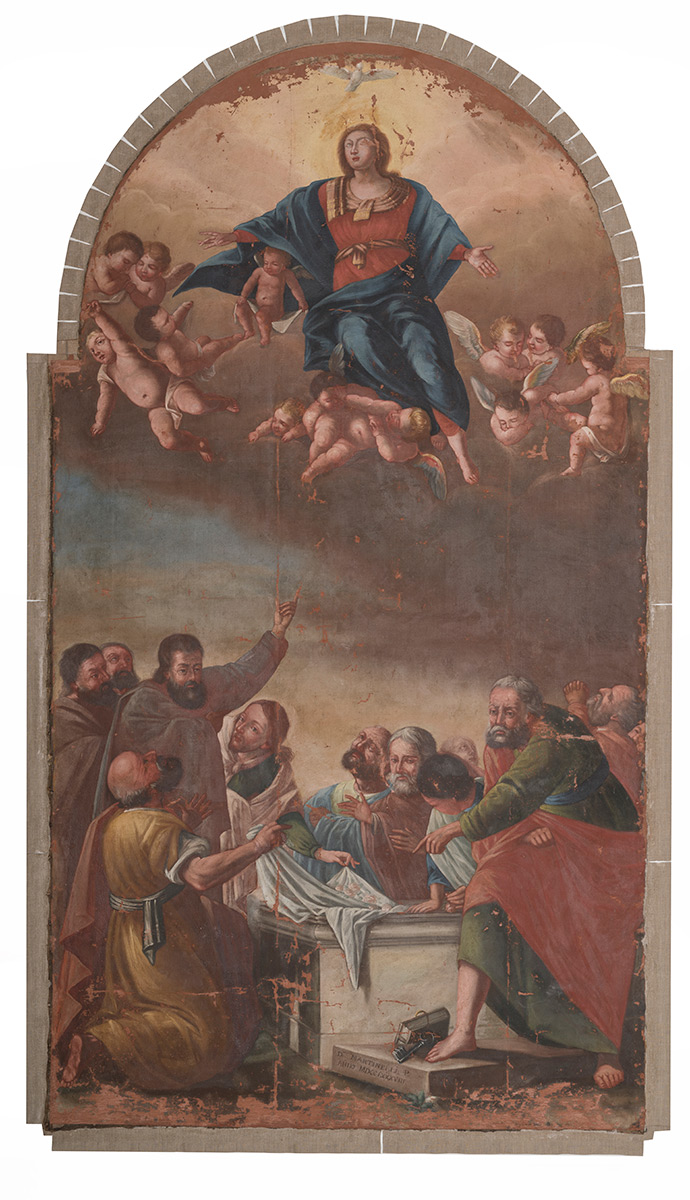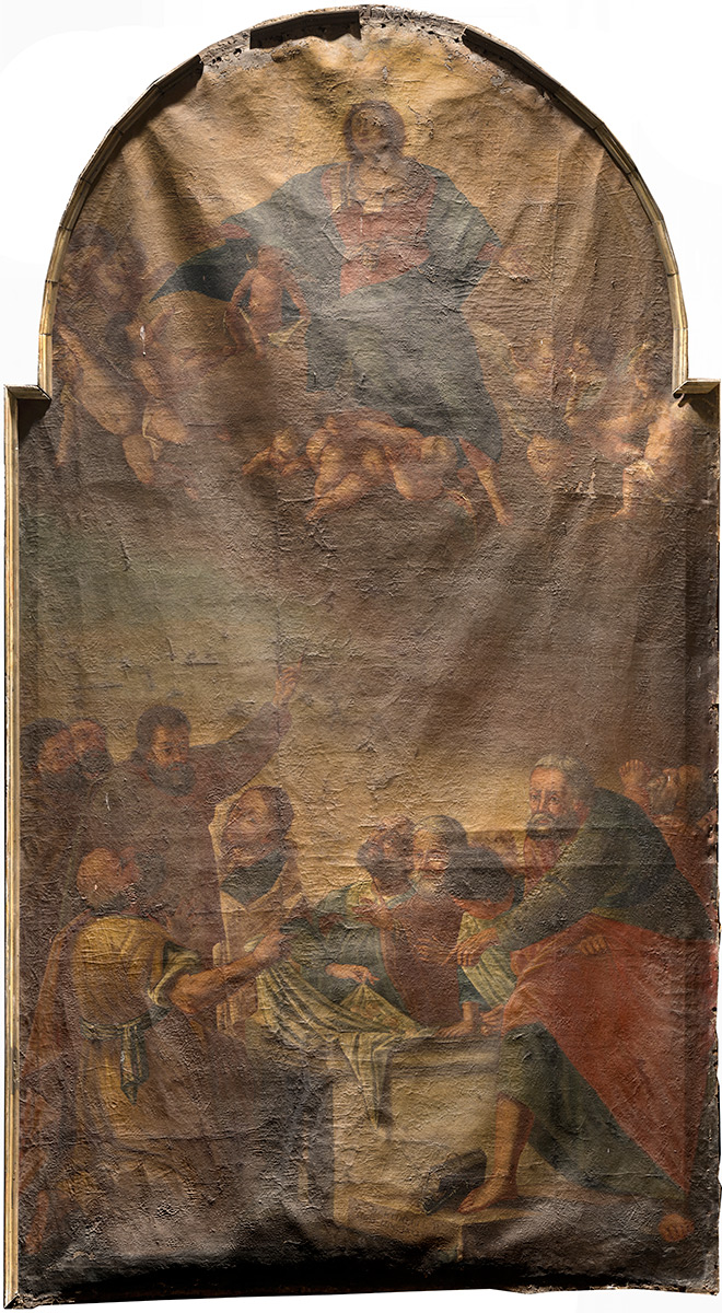 Nakon uklanjanja nataloženih nečistoća i oksidiranog laka, stabilizacije oslabljenih područja slikanog sloja te nadopune oštećenih dijelova platna, slika je podstavljena novim lanenim platnom. Najveći izazov bio je ponovno napinjanje slike na konkavno oblikovan drveni podokvir, budući da takva geometrija uzrokuje neravnomjernu napetost platna, osobito na spojevima ravnih i zakrivljenih dijelova. Kako bi se izbjegla ta opasnost, primijenjen je sustav napinjanja oprugama, koji omogućuje prilagodljivo zatezanje platna, kompenzirajući promjene napetosti uzrokovane temperaturnim i mikroklimatskim oscilacijama unutar crkvenog prostora. Takav se sustav, rijetko primjenjivan na velikim slikama, pokazao izuzetno uspješnim i tehnički sigurnim.