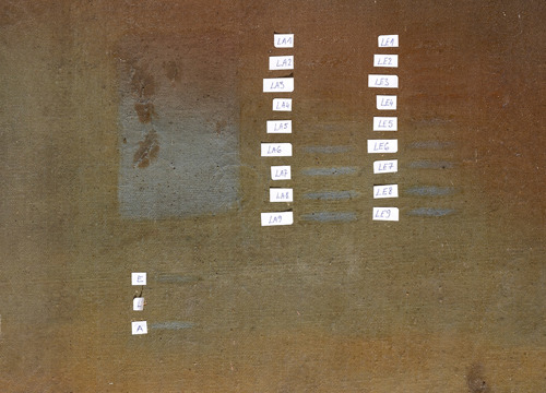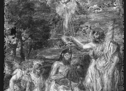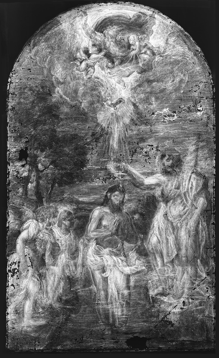 Konzervatorsko-restauratorskim istraživanjima obuhvaćena su snimanja tehnikama ultraljubičaste fluorescencije i infracrvene reflektografije, rendgenske radiografije, stratigrafske analize mikropresjeka te rendgenske fluorescentne spektroskopije (XRF). Rendgenska radiografija otkrila je prisutnost dvaju preslika. Stariji preslik bio je precizno izveden i uvelike je slijedio izvorn prikaz, s ponešto pojednostavnjenim detaljima, dok je kasnija intervencija bila slabije likovne kvalitete. Radiografske snimke potvrdile su da se ispod preslika nalazi dobro očuvan izvorni slikani sloj, osobito u prikazu anđela, pejzaža i arhitekture u pozadini.