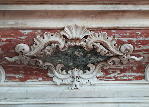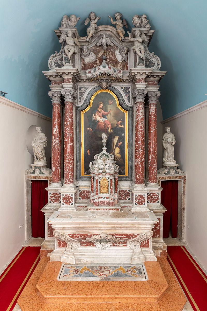 Na sredini antependija oltara je medaljon s volutama i lepezastim ukrasom na vrhu. Središnji dio medaljona isklesan je u zelenom mramoru, dok je površina antependija od crveno-bijelog mramora. Na pravokutnim bazama dižu se sa svake strane po dva stupa od crvenog mramora koji završavaju kompozitnim kapitelima. Na retablu oltara, između stupova, nalazi se oltarna niša iznad koje je glava anđela i mramorni baldahin, iznad kojega je postavljena golubica.