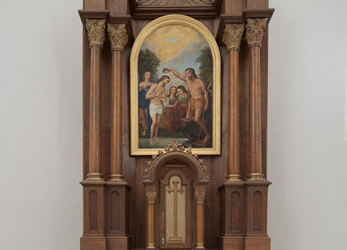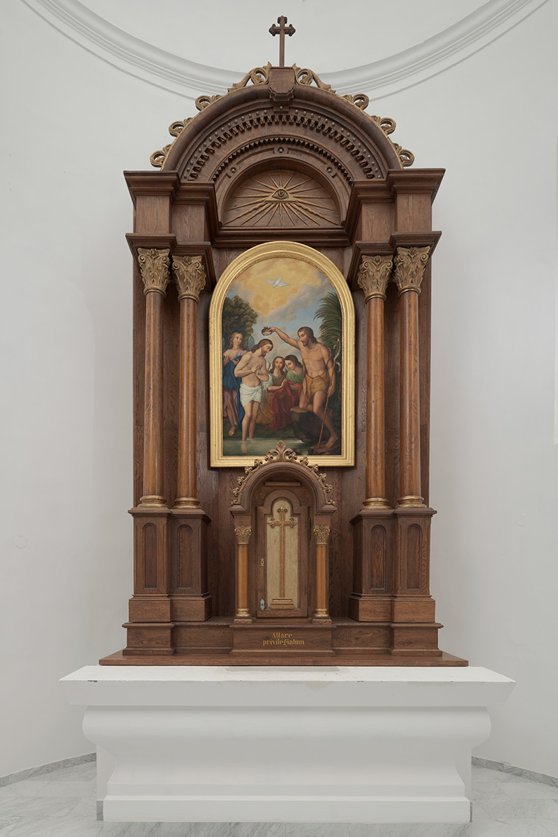 Oltar je izrađen od hrastovine, u neorenesansnom stilu. Retabl je smješten na bazu istaknutu na bočnim rubovima, ispred koje je tabernakul u obliku edikule s ugaonim stupovima i trabeacijom sa suženim lučnim zaključkom. Prednju stranu tabernakula zatvara vratnica svetohraništa koja prati oblik tabernakula, oslikana vitičastim motivima i rezbarenim križem u središtu. Predela retabla raščlanjena je postamentima četiriju visokih stupova s jednostavnih okruglih baza, glatkih tijela i korintskih kapitela, od kojih vanjski par izlazi dublje u prostor. Stupovi podupiru gređe istaknuto u njihovoj osi, koje nad središnjim dijelom retabla prelazi u polukružni zabat, u čijem je središtu rezbareni motiv Božjega oka okruženog zrakama. Na središnjem dijelu retabla nalazi se oltarna pala uokvirena jednostavnim lučno zaključenim ukrasnim okvirom, na kojoj je prikaz Isusova krštenja. Stipes i menza oltara su zidani.