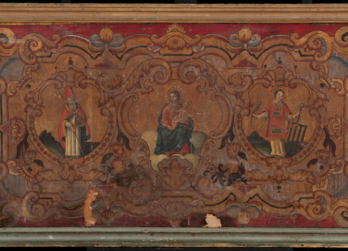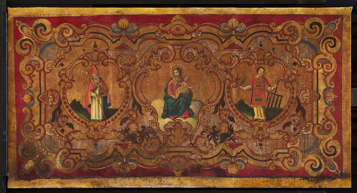 Uljanim bojama na kožnatom nosiocu predoltarnika naslikana su tri medaljona unutar okvira od florealnih motiva. U središnjem medaljonu prikazana je Bogorodica s Djetetom, a u bočnim medaljonima su sv. Ivan Trogirski i sv. Lovro.
