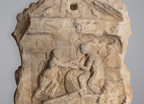 Dok zabat ne odudara previše od standardne produkcije, reljefno polje – koje je od zabata odijeljeno uskom uokvirenom trakom koja sadrži oštećene figuralne prikaze, čini se također ptice – svakako se razlikuje od uobičajenih scena. Taj najvažniji ukrasni motiv na steli ujedno je i najbolje očuvani dio fragmenta, pa nema pretjeranih poteškoća u prepoznavanju pojedinih elemenata reljefa. Lijevim dijelom dominira prikaz utvrđenoga grada, čini se smještenog na nekoj uzvisini ili brežuljku. Osim bedema, jasno se naziru i monumentalna gradska vrata, pa možemo zaključiti da je riječ o nekom važnom naselju. Ispod bedema, desno od vrata, također na lijevoj strani reljefa, prikazom dominira ženska figura u hitonu s plaštom (himatijem) prebačenim preko ramena, koji joj obavija tijelo od bokova naniže i čiji jedan skut ona drži u lijevoj ruci. Žena je prikazana u profilu i u pokretu, kako prelazi dasku koja s pristaništa vodi prema brodu. Brod zauzima desnu stranu reljefa, no jasno su mu vidljive samo krma i oplata, jer tim dijelom scene dominiraju ljudi koji stoje na brodu. Dominantan je lik muškarca koji ženi pruža obje ruke i hvata je za desnicu. Može se pretpostaviti da joj pomaže da se ukrca na brod. On i žena nesumnjivo su glavni likovi kompozicije: polugol je, odnosno nosi samo subligaculum (pokrivalo za genitalije i bedra), što nije neuobičajeno za pomorca, no nosi i plašt, što pak simbolički upućuje na njegovu herojsku ulogu. Iza njega možemo nabrojiti četiri ratnika, naizgled jednako opremljena (okrugli štitovi i kacige s perjanicama). U desnom donjem dijelu reljefnog prikaza naziru se manje ljudske figure koje plivaju u moru uza sam brod. Moguće je riječ o prikazu Tritona, čime se simbolički dočarava more.