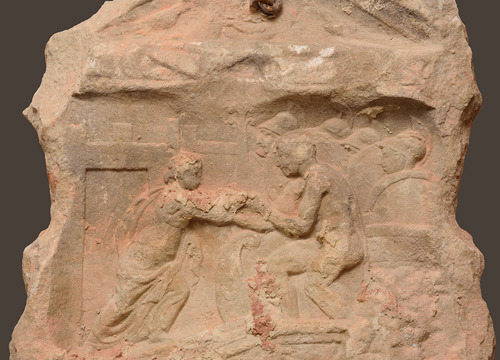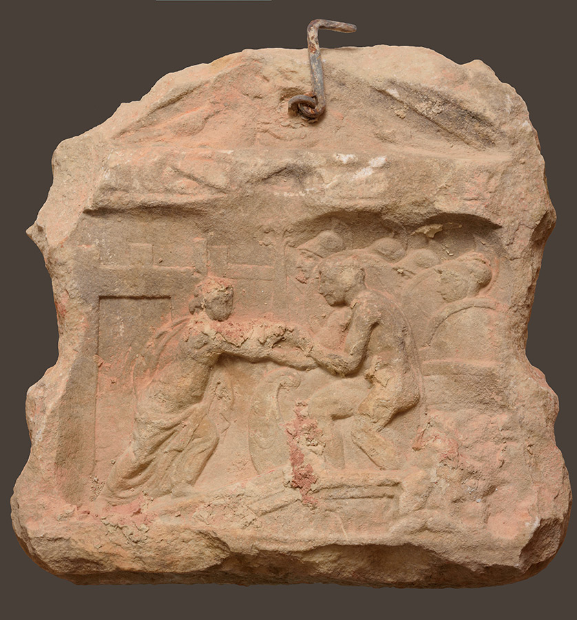 Fragment rimske stele s figuralnim prikazima, uzidan nad vratima župne crkve sv. Terezije Avilske u Bjelovaru (inače ugrađen naopako jer mu je na stražnjoj strani uklesan posvetni natpis iz 18. stoljeća, pa reljef nije ni bio vidljiv sve do radova na crkvi potkraj 19. stoljeća), u arheološkoj je literaturi spomenut još 1901. godine. Ipak, kako je sve donedavno bio nedostupan, o njemu se moglo suditi samo na temelju fotografije snimljene 1895. godine, u kratkom trenutku dok je spomenik bio dostupan i vidljiv, prije nego što je opet uzidan i prekriven žbukom. Unatoč tome, ulomak stele sa zanimljivim i rijetkim prikazom, zahvaljujući bilješci Josipa Brunšmida, nije pao u potpuni zaborav. Za to se ponajviše pobrinuo Nenad Cambi, koji se na taj spomenik osvrnuo u više navrata.