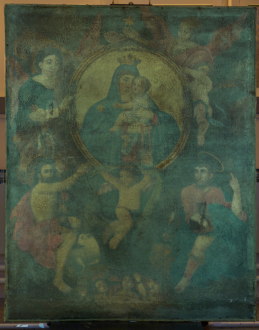 Konzervatorsko-restauratorski radovi na slici „Gospa Karmelska“ provedeni su od 2022. do ožujka 2023. godine (voditeljica: Renata Majcan Šragalj, viši konzervator-restaurator, Odjel za štafelajno slikarstvo 1, Služba za pokretnu baštinu). Slika je izrađena tehnikom ulja na platnenom nosiocu, gustog tkanja i tanjih lanenih niti. Platno je zatečeno izrazito krto, opušteno i mjestimice valovito, a na licu slike ocrtavao se podokvir. Oslik je bio prekriven slojem nečistoće i potamnjelog laka, s vrlo izraženim mrežasto ispucanim pukotinama u formi žličastih deformacija koje su na rubovima bile odignute i izrazito krte. Oštećenja su bila vidljiva na cijeloj površini – slikani sloj se odvajao od podloge te je mjestimično nedostajao, dok je u donjem dijelu platna ispucao. Bile su vidljive i prijašnje intervencije u slikanom sloju.