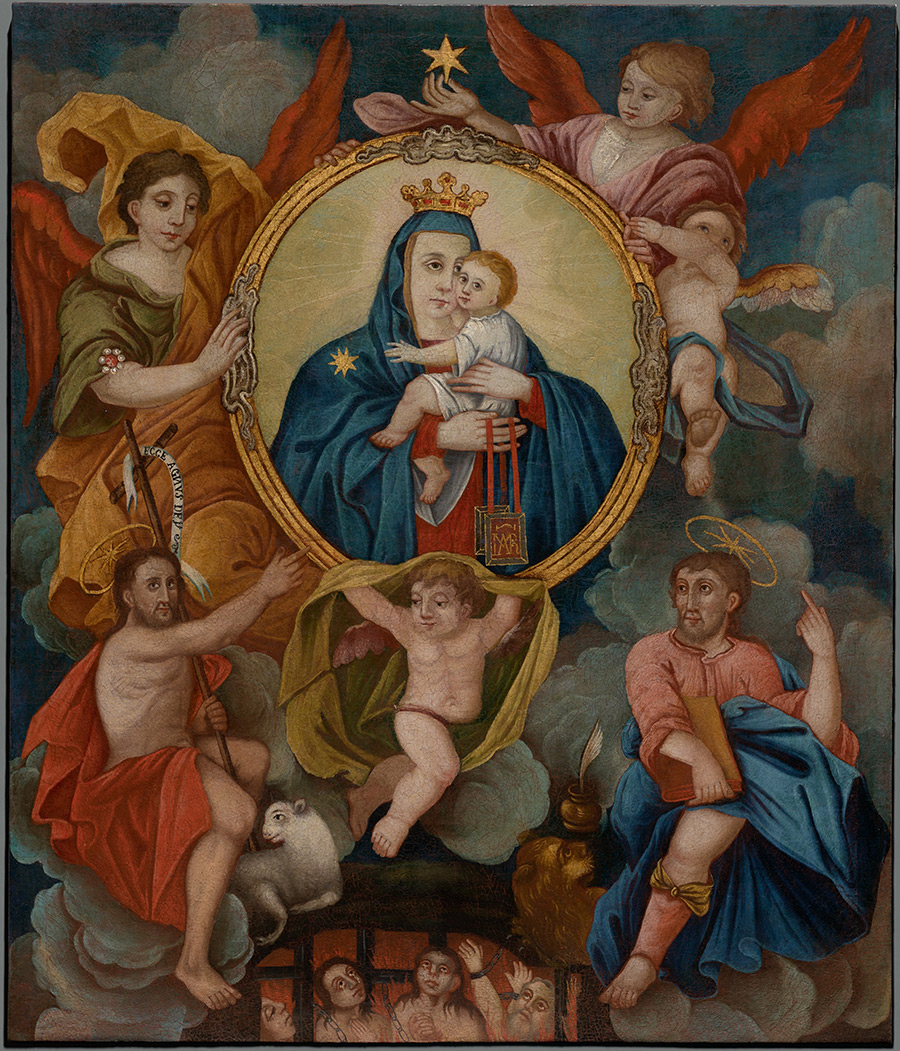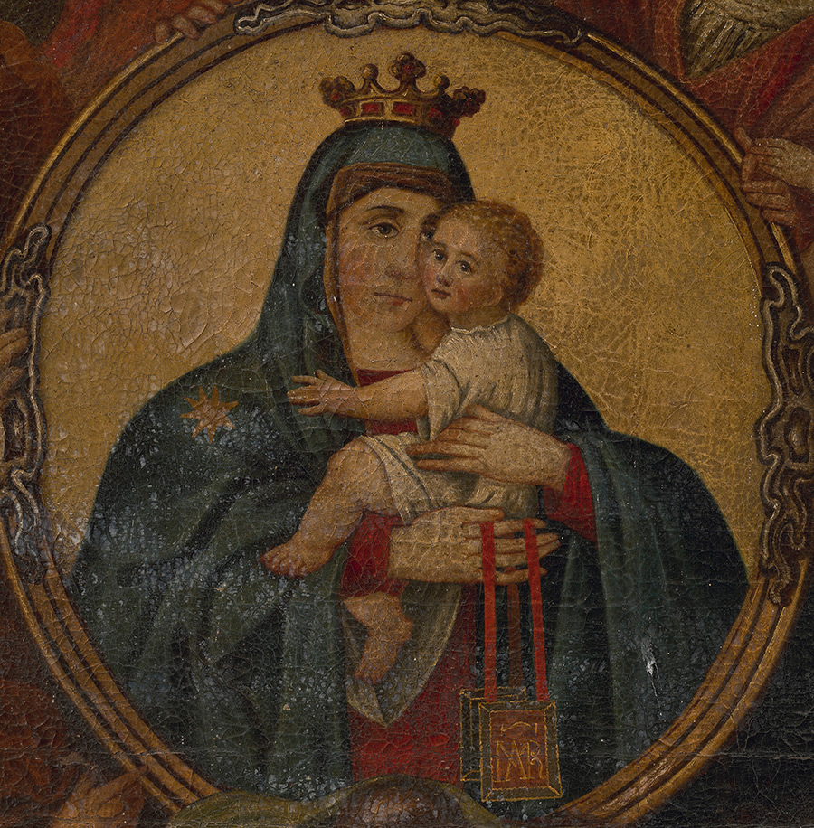 Ikonografija Gospe Karmelske, Bogorodice od škapulara, nastala je na temelju vizije oca Šimuna Stocka, generala karmelićanskoga reda, u kojoj mu Bogorodica predaje škapular, uzak i dugačak komad tkanine koji je dio habita mnogih monaha, a simbolizira Kristov jaram. Procvat i širenje kulta Gospe Karmelske potaknut je protureformacijskim pokretom koji je isticao katoličku doktrinu o čistilištu, ali i proglašenjem Gospe Karmelske općim blagdanom Crkve 1726. godine. Ikonografija baroka stoga prikazuje Gospu kako s Djetetom u krilu lebdi iznad čistilišta, držeći škapular, a na baščanskom primjeru, uz anđele, prikazani su i sv. Ivan Krstitelj i sv. Marko evanđelist.