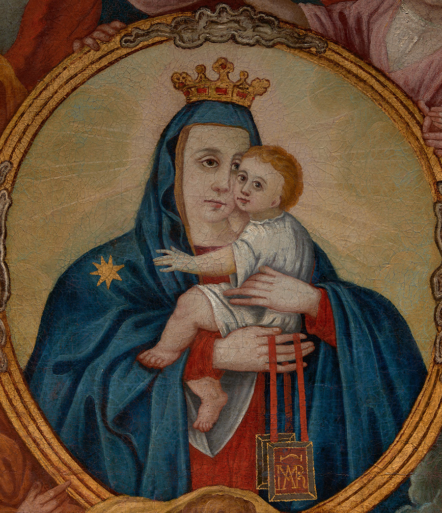 Istraživački radovi upućuju na to da su okvir unutar slike koji pridržavaju dva anđela, kruna iznad glave Gospe Karmelske te aureole sa zvijezdama iznad glava svetaca izvedeni zlatnim listićima. Dodatnim konzervatorsko-restauratorskim istraživanjima, tijekom kojih je snimljen rendgenogram, ustanovljeno je da je slika u cijelosti preslikana, pri čemu nije mijenjan ikonografski sadržaj. Likovi na slici preslikani su u jednom sloju, a pozadina likova s oblacima preslikana je dva puta.
