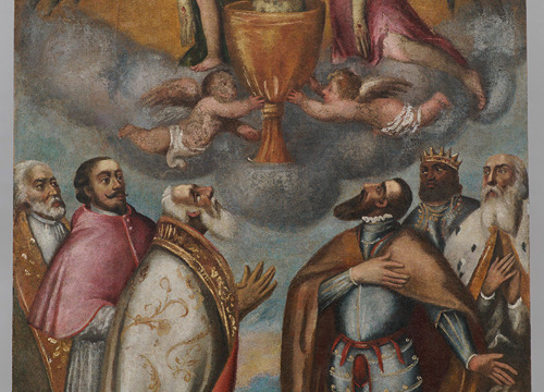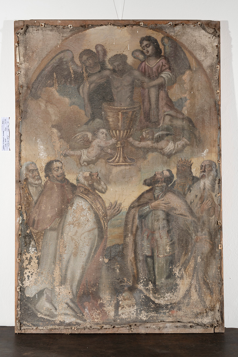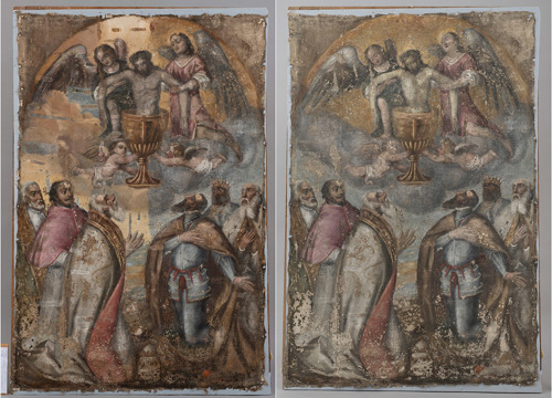 Usporedbom stanja očuvanosti slikanih slojeva vidljivih na rendgenskoj snimci sa zatečenim stanjem, potvrđena je loša očuvanost detalja lica u donjem dijelu slike; stoga je odlučeno da se na gornjem dijelu slike (na kojemu je prikazano tijelo Kristovo uronjeno u kalež) preslik ukloni, a u donjem (na kojemu su prikazani predstavnici crkvene i svjetovne vlasti) djelomično zadrži.