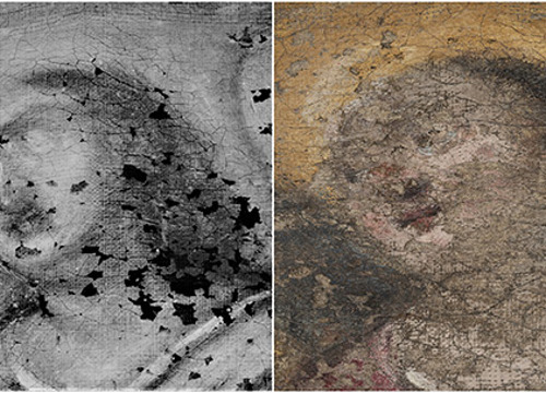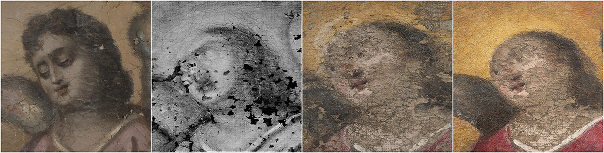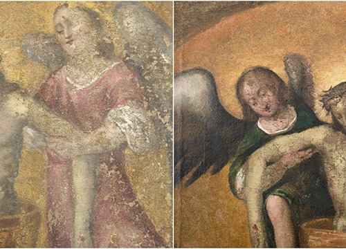 Usporedbom rendgenske snimke i zatečenog oslika bio je vidljiv potpuno izmijenjen položaj glave desnog odraslog anđela. U izvornom sloju, glava i pogled usmjereni su prema nebu, dok je u presliku glava bila predimenzionirana, a pogled poluzatvorenih očiju i oborene glave usmjeren prema Kristovu tijelu. Kristovo čelo je u izvornom sloju više i naglašenije, dok je trnova kruna elegantnije naslikana i ne dominira, za razliku od krune na zatečenom osliku. Zatečeni pastozni preslici lica posve su promijenili karakter prikazanih figura, što je primjetno i u donjem dijelu slike na drugom liku s lijeve strane, koji ima bujnu kosu, brkove i bradu, dok rendgenska snimka otkriva golo lice mršavih obraza i kratke kose.