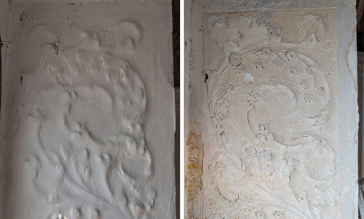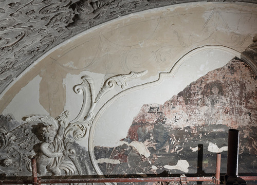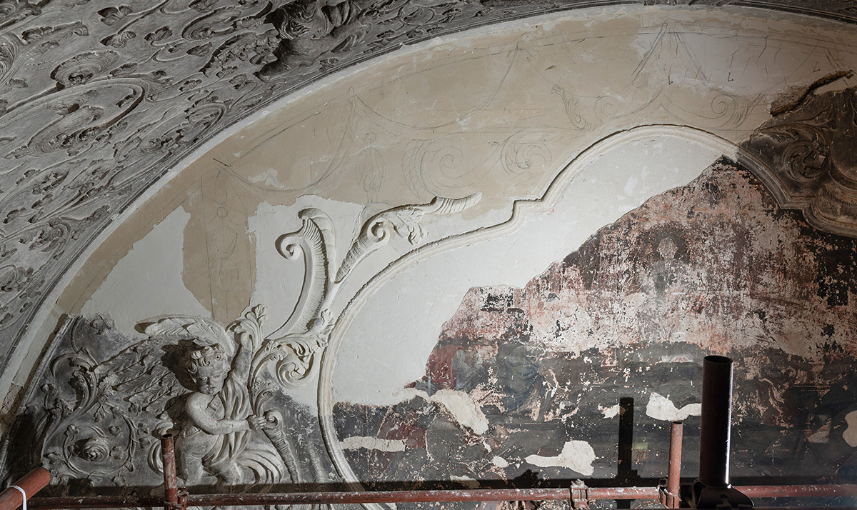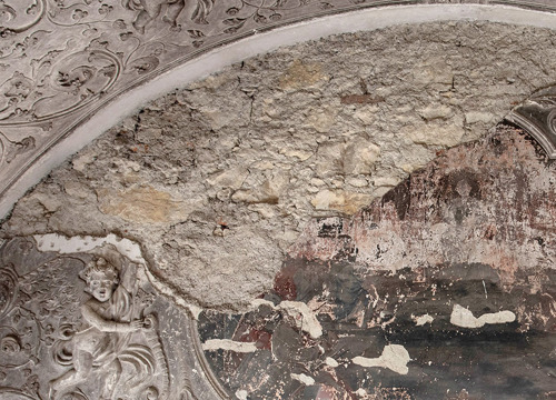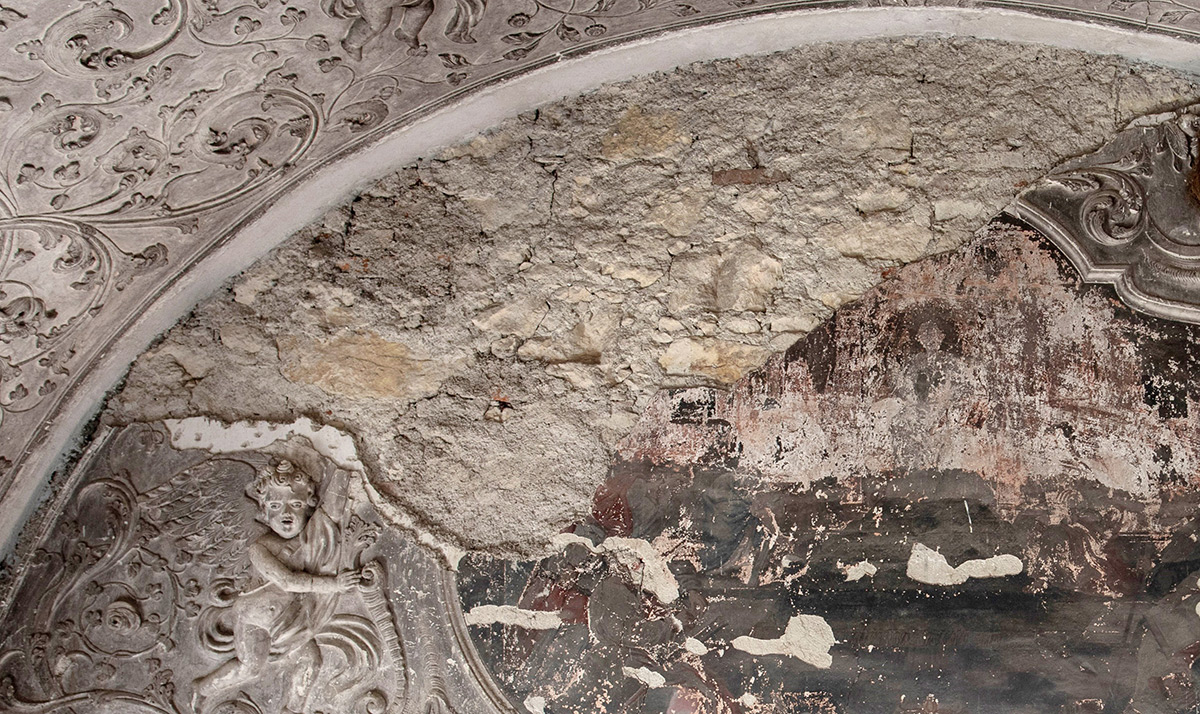 Štukodekoracija svoda izrazito je oštećena detonacijom krajem Drugoga svjetskog rata. Vijenac i dekorativni elementi u nišama i oko niša prozora prije početka radova bili su prekriveni debelim naknadnim slojevima žbuka i naliča, pa je izvorni sloj bio gotovo nečitak zbog gubitka plasticiteta uzrokovanog višekratnim ličenjem.