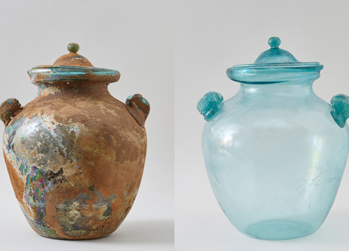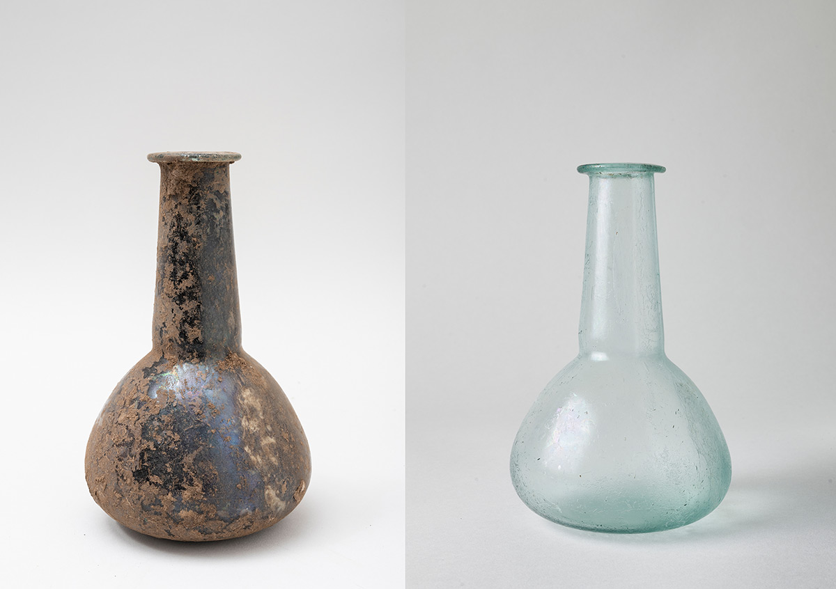 Nađeni su i brojni stakleni predmeti, dijelom potpuno očuvani, samo prekriveni zemljom i kalcifikatom. Takvi se predmeti najprije peru i čiste mekim četkicama; slijedi čišćenje blagom kiselinom radi uklanjanja kalcifikata. Fragmentirani predmeti su spajani, lijepljeni i rekonstruirani. Više stotina staklenih predmeta čine staklene urne, boce, balzamariji, čaše, posudice i tanjuri.