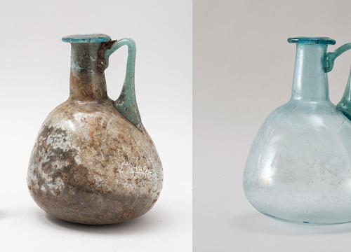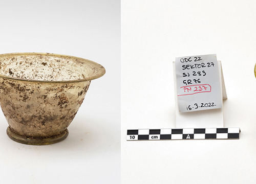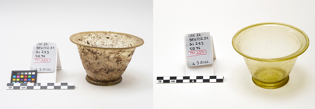 Nastavljen je i pregled brojnih staklenih predmeta. Dio njih potpuno je očuvan, samo prekriven zemljom i kalcifikatom, a velik dio je fragmentiran i zahtijeva dugotrajan pregled, sortiranje i odluke o budućim konzervatorsko-restauratorskim radovima, što je u tijeku. Svi stakleni posebni nalazi ove su godine oprani mekim četkicama; uslijedit će čišćenje blagom kiselinom radi uklanjanja kalcifikata. Riječ je o više stotina staklenih predmeta (staklene urne, boce, balzamariji, čaše, posudice i tanjuri).