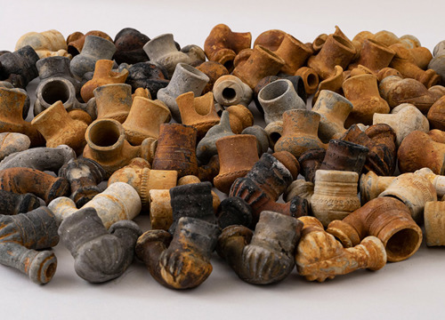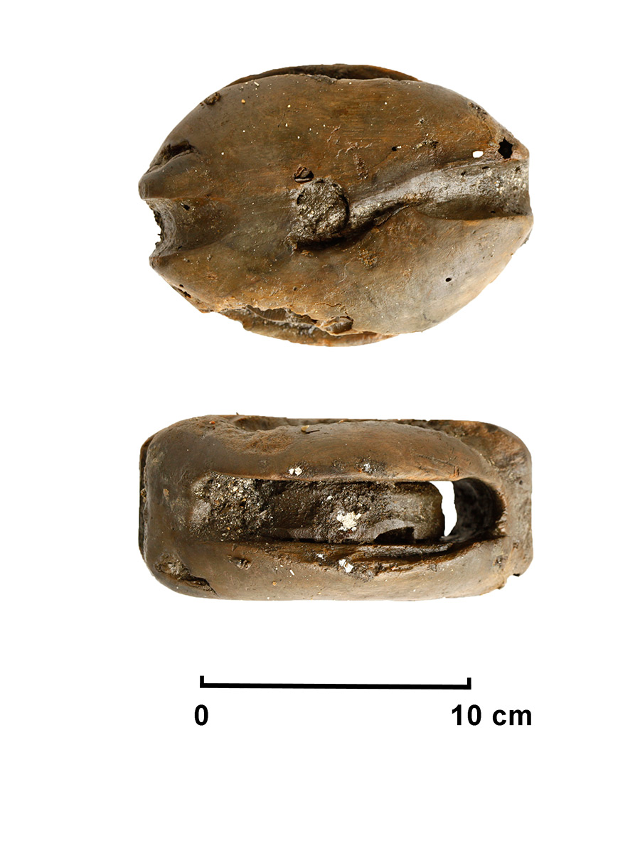 Nedaleko je pronađen i drveni predmet s ručkom nalik na grabilicu za rasuti teret. Na temelju njega može se naslutiti da je, uz teret šalica za kavu, lule za duhan i nargile, brod prevozio i teret rastresite robe, poput kave ili duhana. Svi navedeni segmenti tereta upućuju na to da je riječ o orijentalnom paketu 'proizvoda za slobodno vrijeme', što je uključivalo i egzotične namirnice, poput orijentalnih čajeva, čokolade, kave, duhana i opijuma te rekvizite za njihovu konzumaciju. Takvi paketi redovito su kolali na trgovačkoj trasi iz trgovačkih luka Aleksandrije i Istanbula prema Veneciji i drugim lukama na Zapadu, a brodolom kod Bisaga jedinstven je primjer takve trgovine. Teret broda sa šalicama za kavu, lulama, nargilama, a moguće i sirovinama poput kave ili duhana, također podsjeća na pribor za opremanje kavana. One su se, najčešće po uzoru na orijentalne kavane (tur. kahweh, koltuk kahvesi), od druge polovice 17. stoljeća počele otvarati diljem Europe, a do polovice 18. stoljeća postaju protagonisti društvenog i intelektualnog života na Zapadu. Prema tome, vrlo je moguće da je teret broda bio namijenjen opskrbi kavana. (VZ)