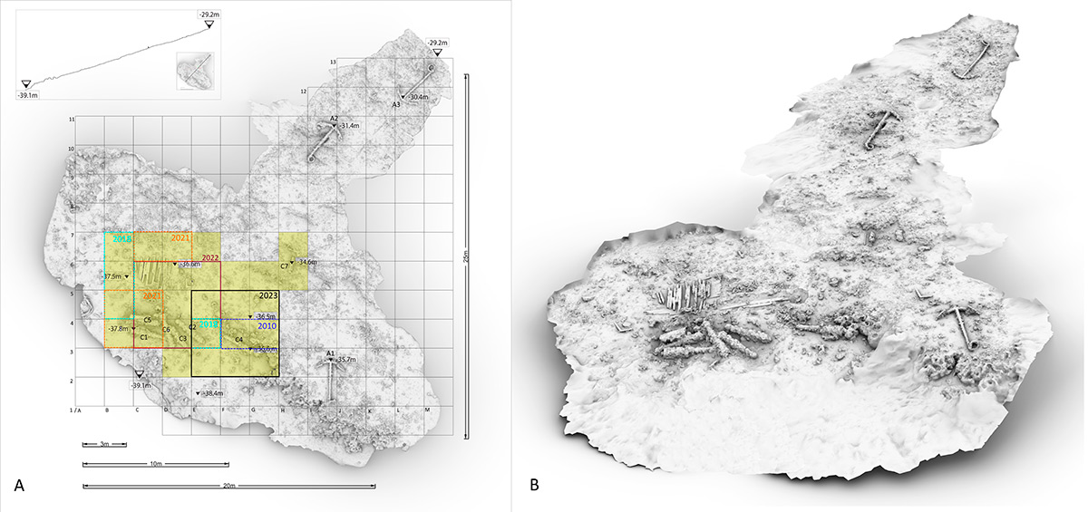 Riječ je o ostacima trgovačkoga broda s bogatim teretom osmanskih keramičkih proizvoda, stradalog početkom 18. stoljeća na plovidbi kroz Kornatski kanal. Dosadašnja istraživanja pokazala su da se na dubini od 30 do 50 metara i na području veličine oko 25 x 25 metara nalaze ostaci konstrukcije i opreme potonuloga broda: tri masivna dvokraka sidra izrađena od kovanog željeza, brodsko topništvo u dva tipa i kalibra cijevi te brojna pokretna arheološka građa, podijeljena prema osnovnim obilježjima i namjeni u dvije osnovne skupine, brodsku opremu i trgovački teret broda. Područje nalazišta je radi lakšeg snalaženja i dokumentacije podijeljeno na 169 kvadratnih polja dimenzija 2 x 2 m, označenih slovima i brojkama od A/1 do M/13, orijentiranih sjever – jug. U ovoj godini nastavilo se s iskopom u kvadrantima E/3, E/4, E/5, F/3, F/4, F/5, G/3, G/4 i G/5, na dubini između 36 i 38 metara. Kao i u dosadašnjim istraživanjima, iskop se provodio vodenim sisaljkama unutar kvadratnoga dokumentacijskog mrežišta, a vidljive strukture i nalazi otkriveni na dnu nacrtno su i fotografski dokumentirani in situ. Pokretni nalazi s dna su evidentirani, fotografirani i stavljeni na odsoljavanje u slatku vodu do daljnje konzervatorsko-restauratorske obrade. Kao i u prethodnim kampanjama, programom Agisoft PhotoScan izrađen je digitalni ortofoto i 3D model nalazišta i određenih segmenata nalazišta.