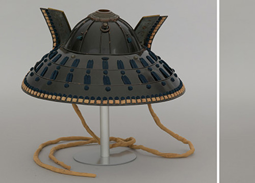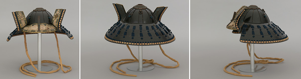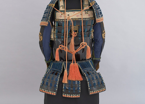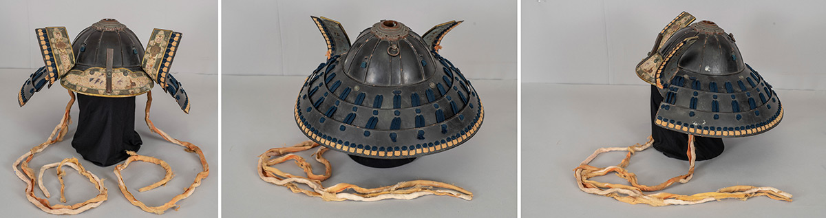 Samurajski oklopi tradicionalno se izlažu na posebnoj drvenoj vješalici postavljenoj na originalnoj kutiji za pohranu, najčešće izrađenoj od drva i kože s utisnutim znakom obitelji. Umjesto drvene vješalice za izlaganje samurajskog oklopa na originalnoj kutiji u ovom je slučaju prilagođen gornji dio lutke. (GC, MBM i MZ)