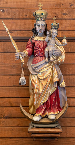 Oltar Sv. Trojstva je do ratne evakuacije 1991. godine bio smješten na sjevernoj strani crkve sv. Marka evanđelista, odnosno "na strani Evanđelja" (vizitacija iz 1692. godine). Jednokatni oltar tektonskog tipa sastoji se od predele, retabla i atike. Retabl s atikom postavljen je na visoku predelu s kubično istaknutim postamentima glatkih stupova retabla, jednostavnih okruglih baza i kompozitnih kapitela. Tijela stupova su s gornje i donje strane ukrašena plitkom rezbarijom koja kombinira motive geometrijskog i vegetabilnog ornamenta koji se razvlači u vitičaste preplete. U središtu pravokutnog retabla nalazi se polukružno zaključena niša sa skulpturom s prikazom Bogorodice koja stoji na polumjesecu, lijevom rukom pridržava malog Isusa, a u desnoj drži žezlo. Pozadina niše iza Bogorodice ukrašena je rezbarenim zrakama. Na glavama Bogorodice i Isusa nalaze se metalne krune. Iznad niše su dva hrskavičasta cvijeta. Retabl rube uholika oltarna krila s viticama ukrašenima motivima hrskavica. Iznad retabla je vijenac poduprt stupovima. Vijenac se sastoji od friza s rezbarenim vitičastim prepletom u sredini i rezbarenim cvjetovima na kubično istaknutim rubovima, te od arhitrava jednostavne vučene profilacije koji se na rubovima kvadratično izvlači u prostor. Na vijenac je smještena niska pravokutna atika u čijem je središtu slika "Sv. Trojstvo". Slika je bočno omeđena dvjema rezbarenim konzolama s rezbarenim motivima palmeta koje podupiru lomljeni zabat u obliku voluta koje se na unutarnjim krajevima razvlače u vitičastu vrpcu ukrašenu shematiziranim motivom hrskavice. Na rubovima atike nalaze se konzole u obliku voluta na koje su smještene skulpture sv. Barbare i nepoznate svetice.