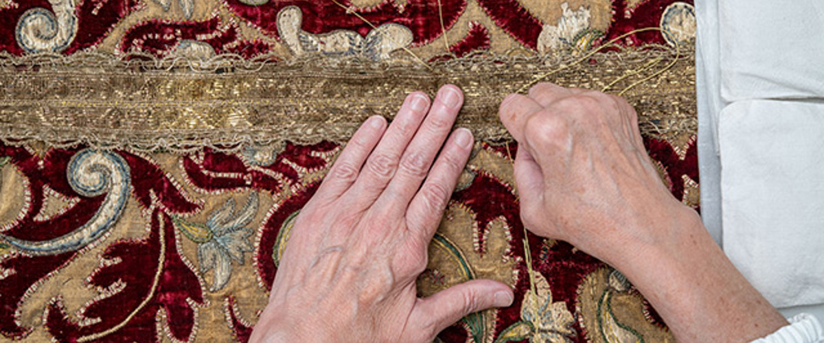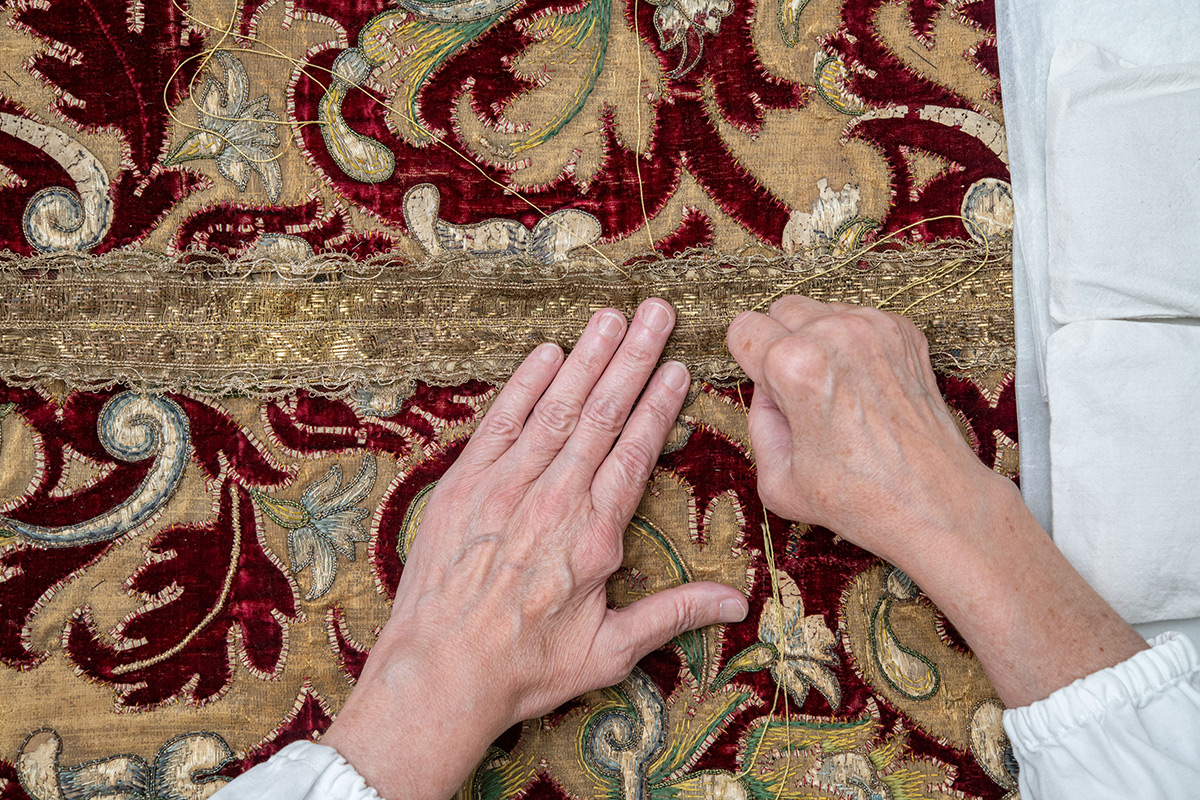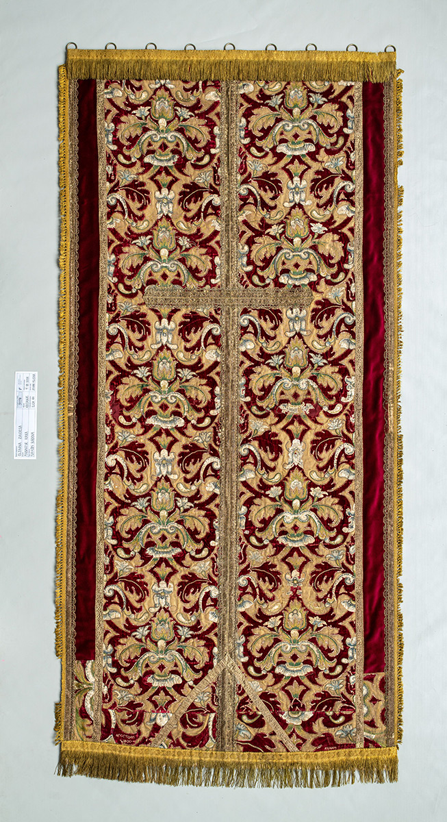 Tijekom konzervatorsko-restauratorskih radova 2020. godine (voditeljica Sandra Lucić Vujičić, Odjel za tekstil, papir i kožu, Služba za pokretnu baštinu) otkriveni su fragmenti svilenih tkanina iz 16. i 18. stoljeća kojima su nadomješteni nedostajući dijelovi izvornih tkanina te dvije vrste ukrasnih mesinganih traka. Izvorna dekoracija zavjese izrađena je tehnikom veza a riporto, upotrebom svilenih tkanina i papira, pozlaćenih i frisé uzica te raznobojnih svilenih niti. S obzirom na nove podatke, moguće je s velikim oprezom pretpostaviti dataciju katapetazeme u prijelaz 16. u 17. stoljeće, dok se izvezena godina može povezati s posljednjom većom intervencijom. Također se može pretpostaviti da je za izradu katapetazme 1800. godine upotrijebljeno nekoliko materijala.