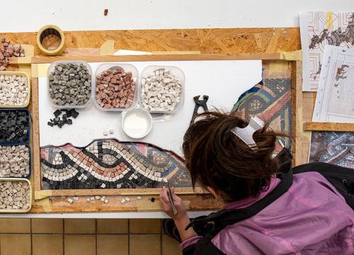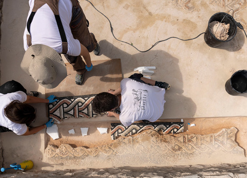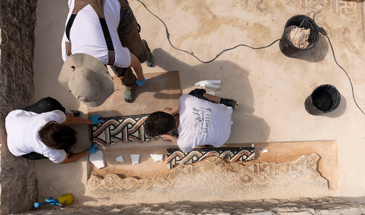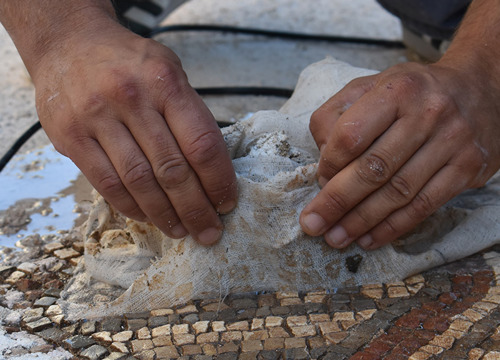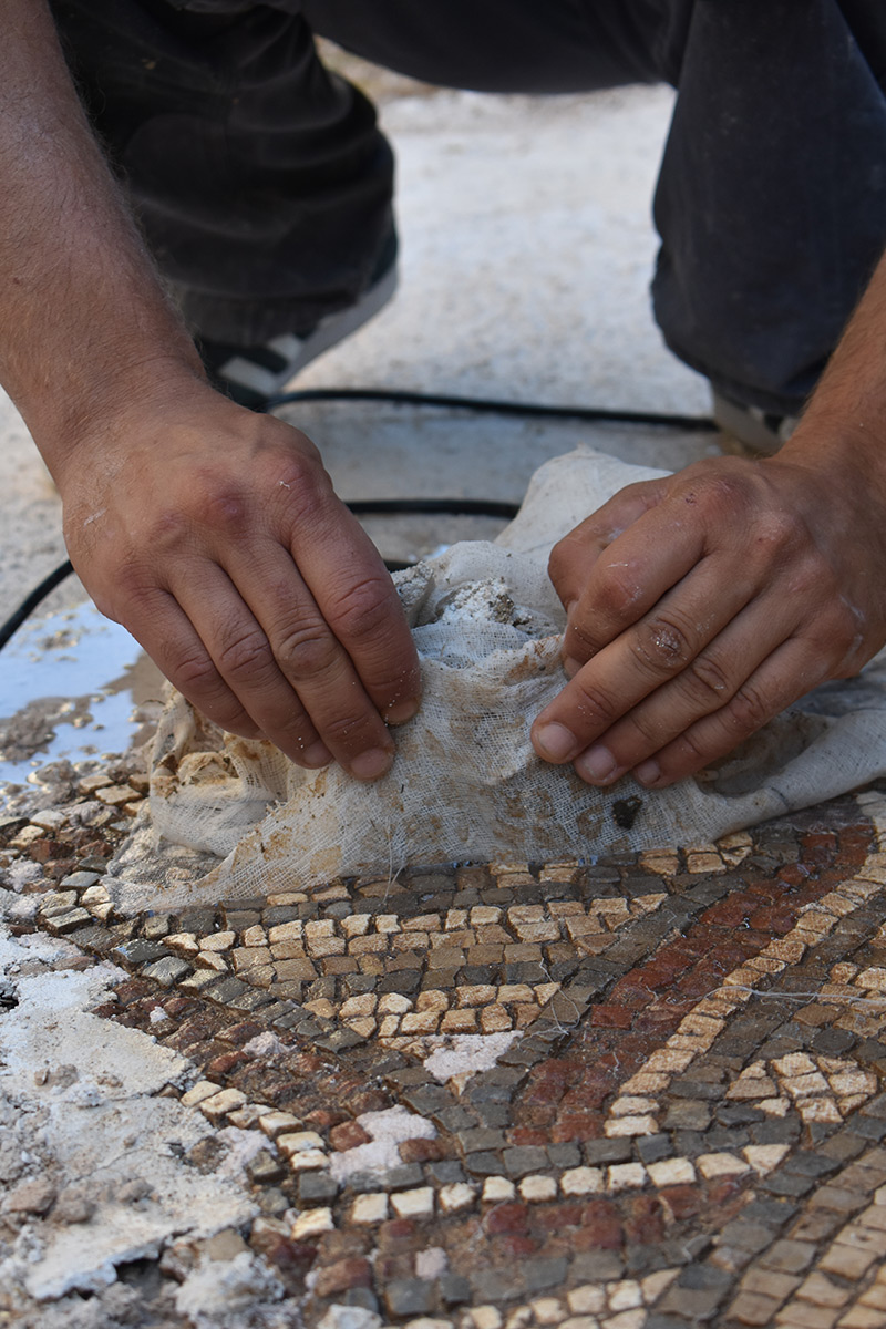Nepredvidivi djelomični ili potpuni gubitak ostataka mozaika in situ zahtijevao je ekspeditivnost pri njegovu stabiliziranju/konsolidiranju s ciljem očuvanja materijalnog i duhovnog integriteta. Stabiliziranje/konsolidiranje je podrazumijevalo: konsolidiranje lica mozaika i dizanje mozaika s izvornog mjesta prema planu rezova, konsolidiranje poleđine ulomaka u radionici, čišćenje i pripremanje prostorije za prihvat mozaika, postavljanje nove žbukane podloge u obuhvatnoj zoni, pozicioniranje mozaika in situ, čišćenje lica mozaika od zaštitnog sloja, postavljanje završne žbuke između ulomaka mozaika i konsolidiranje lica mozaika. Konsolidiranje lica mozaika izvedeno je različitim metodama i tehnikama (injektiranje, konsolidiranje mehaničkih oštećenja i sljubnica/fuga te impregniranje lica mozaika). Nakon vraćanja stabiliziranih izvornih mozaika in situ, uslijedila je sljedeća radna faza u radionici – izrada replike/rekonstrukcije dijela mozaika i njegovo postavljanje in situ. Za izradu novih ulomaka izrađen je detaljni grafički crtež/predložak sa shemom likovne geometrijske dekoracije mozaika u odnosu na izvorni mozaik. Predložak je izrađen u mjerilu 1 : 1 i sastavljen je plan/nacrt izrade s budućim ulomcima rekonstrukcije. Rekonstrukcija je izrađena u pet različitih dijelova/ulomaka određene veličine radi lakše manipulacije pri izradi, postavljanja in situ i lakšeg transporta iz radionice do nalazišta. Nakon izrade crteža, ručno su izrađene kockice od prirodnog kamena lokalnog porijekla, koje su poslužile za izradu novih ulomaka tzv. indirektnom metodom. Prije postavljanja replika in situ, ulomci su probno postavljeni u obuhvatno područje; pritom se pazilo da slijede likovnu dekoraciju i visinsku razliku između izvornih mozaika. Nakon utvrđivanja svih navedenih činjenica, postavljen je žbukani prihvatni sloj između podloge i ulomaka. Kad je postignuta kompatibilnost ulomaka i podloge, uslijedilo je mehaničko-kemijsko čišćenje površine te izrada retuša s izvornim kockicama na mjestima većih mehaničkih oštećenja, kao i na spoju izvornih i novih ulomaka mozaika. Novonastala mozaična površina fugirana je adekvatnom vapnenom žbukom, dodatno je očišćena kemijski neutralnim sredstvima i naposljetku impregnirana. (IJ)
