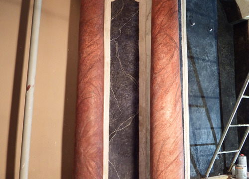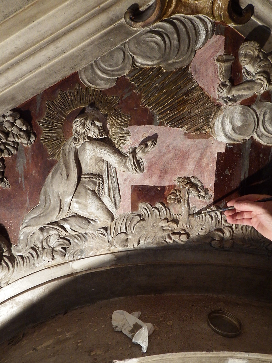 Započelo se i s retušem slikanih površina oltara, što će biti završeno do kraja godine. Korišteni su praškasti pigmenti razrijeđeni tilozom. Na atici oltara, dio reljefnog prikaza bio je pozlaćen. Kemijskom analizom utvrđeno je da se radi o umjetnoj pozlati, koja je na taj način i obnovljena.