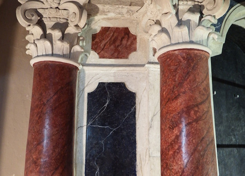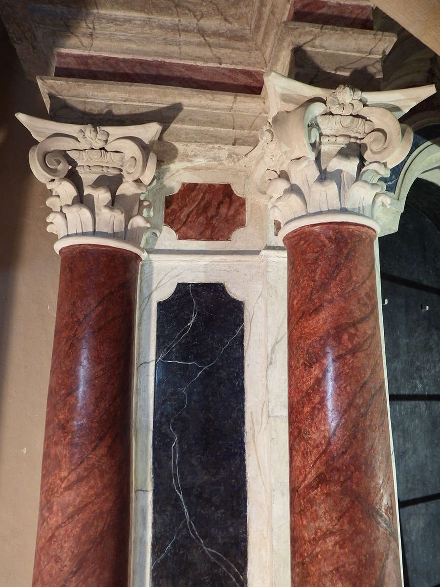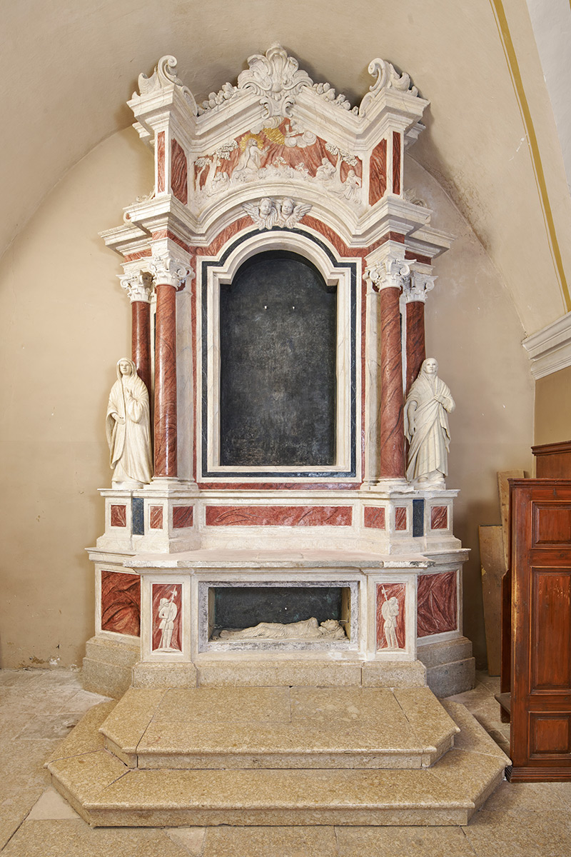 Četiri oltara u bočnim kapelama izvedena su u štuku (oltari sv. Josipa, sv. Antuna Padovanskog/sv. Liberata, sv. Margarite/Rite iz Kortone i Sv. Križa) u baroknoj obnovi interijera u trećoj četvrtini 18. stoljeća. Arhitektonsko oblikovanje oltara, prislonjenih uz vanjske zidove kapela, ponavlja osnovnu koncepciju vidljivu i na dva kamena oltara unutar bočnih kapela, središnje lučno zaključene oltarne pale (osim na oltaru Sv. Križa, koja u središnjem dijelu retabla ima segmentno zaključenu nišu s drvenim raspelom) flankiraju dijagonalno u prostor istaknuti kompozitni stupovi iza kojih je po jedan pilastar i jedan polustup. Uza stupove, na istaknutim podnožjima, smještena je sa svake strane po jedna svetačka figura u punoj plastici. Menze i atike su ukrašene reljefima, bogato raščlanjenom arhitektonskom plastikom, volutama, lisnatim motivima i kerubinskim glavicama. Oltari su oslikani tako da imitiraju različite vrste mramora. Istraživanjima je utvrđeno da su višekratno preličeni te da su na pojedinim mjestima plohe prevučene slojem gipsa, čime je izgubljen izvorni plasticitet i kolorit arhitektonike oltara i štukatura.
