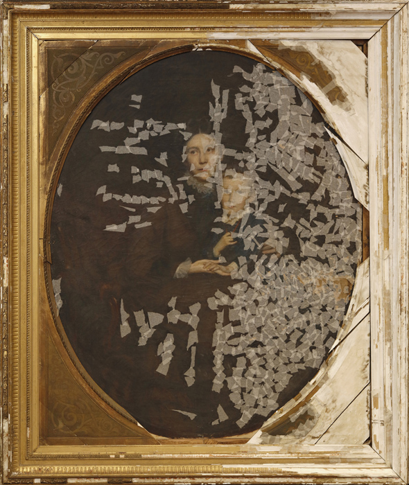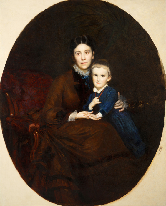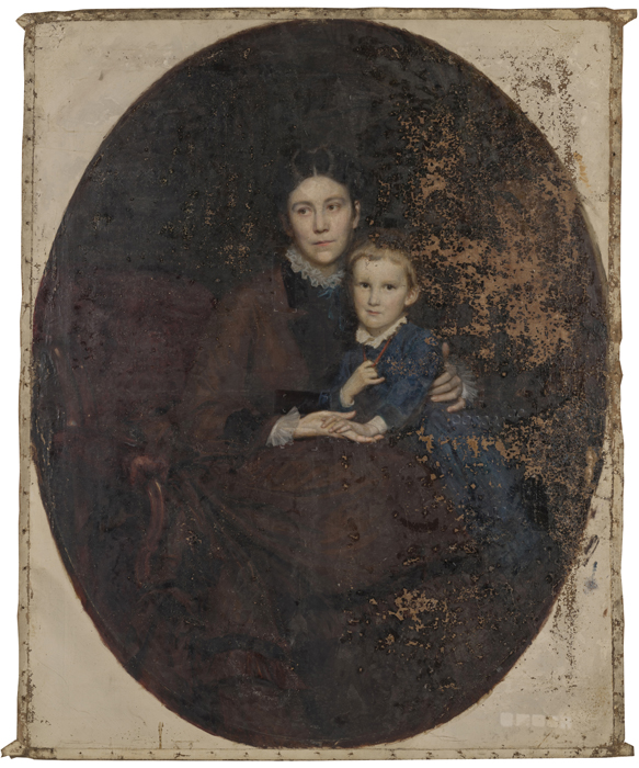 Na slici ovalnog formata, u pravokutnom profiliranom pozlaćenom okviru s drvenim ovalnim paspartuom, prikazana je mlada žena u naslonjaču sa sinom Martinom koji joj sjedi u krilu. Pretpostavlja se da je riječ o Emmi Leitner, rođ. Tuszkau (1844.–1916.). Slika je bila u iznimno lošem stanju zbog nepovoljnog utjecaja vlage, osjetljivosti sloja podloge i neadekvatnih mikroklimatskih uvjeta. Najveći dio izraženih oštećenja i gubitaka slikanog sloja i podloge nalazio se na desnoj polovici slike. Veća oštećenja slikanog sloja i podloge bila su i na čelu portretiranog dječaka i njegovoj plavoj opravi. Tutkalno-kredna podloga na koju je položen bolus i slikani sloj na bazi lanenog ulja, zbog oštećenja, velikim dijelom se lako odvajao od podloge. Na površini slike bila je vidljiva izražena, gusta i raznolika mreža starosnih pukotina u slikanom sloju. Zbog velikoga gubitka i oštećenja, slikani sloj je u Muzeju preventivno zaštićen japanskim papirom.