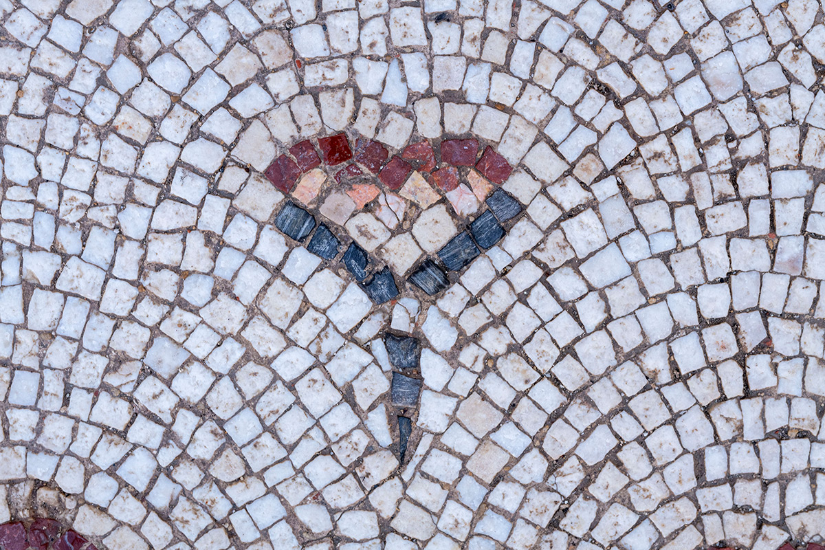 Na sjevernoj strani nalazišta u prostoriji s apsidom nalazi se geometrijsko-figuralni podni mozaik ukupne površine 18,42 m2, podijeljen u dva dekorativna polja (pravokutno i polukružno). Na većem pravokutnom polju istaknut je središnji prikaz pauna u kružnici upisanoj u dva isprepletena dekorativna kvadrata, uokvirena motivom dvostruke pletenice. U apsidi navedene prostorije prikazan je u polukružnom polju klasični kršćanski motiv: kantar s biljnim viticama uokviren motivom višebojne trake. Na istočnoj strani nalazišta u polukružnoj prostoriji je drugi mozaik, ukupne površine 6,32 m2, dekoriran pravilno dijagonalno postavljenim pupoljcima ruže i uokviren motivom dvostruke pletenice. Na istočnoj strani nalazišta, na mjestima kasnijih faza građenja, pronađeni su segmenti mozaika izrađeni crno-bijelim kockicama.
