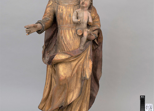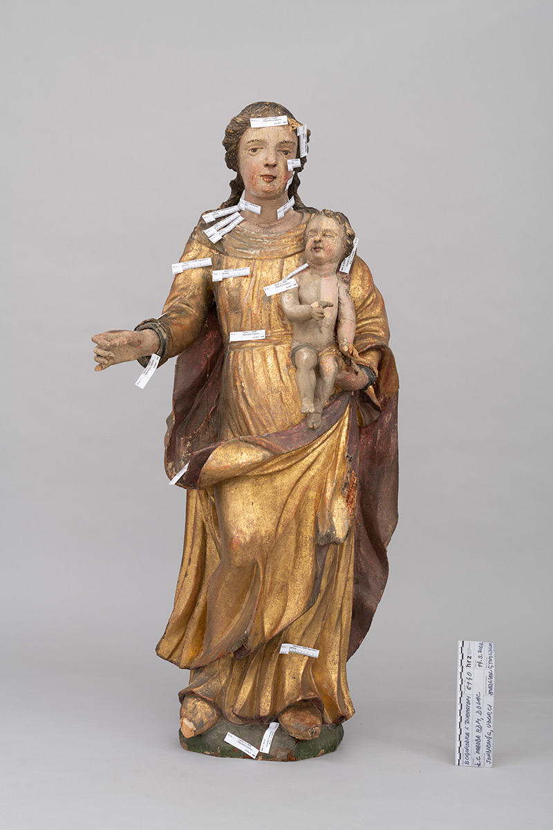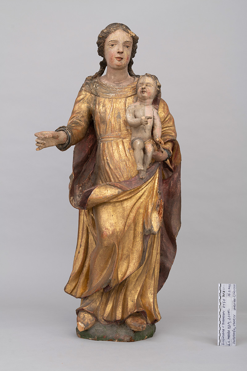 Skulptura Bogorodice s Djetetom teško je stradala u potresu kad joj se nakon pada odlomilo više dijelova: kruna i žezlo Bogorodice, mali prst desne ruke, vrh cipele, kruna malog Isusa, desna noga, lijeva ruka, prsti desne ruke. Skulptura je evakuirana i smještena u čuvaonicu umjetnina Zavoda. Površina je bila prekrivena slojem nečistoće s mnogim vidljivim mehaničkim oštećenjima. Zatečene su intervencije iz prethodnih zahvata: diskolorirani popravci premaza metalizirane imitacije zlata na zlatu, kao i djelomično preslikani dijelovi inkarnata.