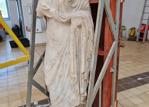 Istraživanja koja provodi Hrvatski restauratorski zavod obuhvaćaju i mjerenje vodoupojnosti kamena, analizu prisutnosti štetnih topivih soli, probe čišćenja kamena, povijesno-umjetničku analizu te detaljno dokumentiranje zatečenog stanja uz 3D lasersko skeniranje. Radovi na kamenim spomenicima s opuzenskog trga izvode se in situ, ali je skulptura carice Livije transportirana u radionicu Dračevac, gdje će se nastaviti konzervatorsko-restauratorski radovi. (HU)