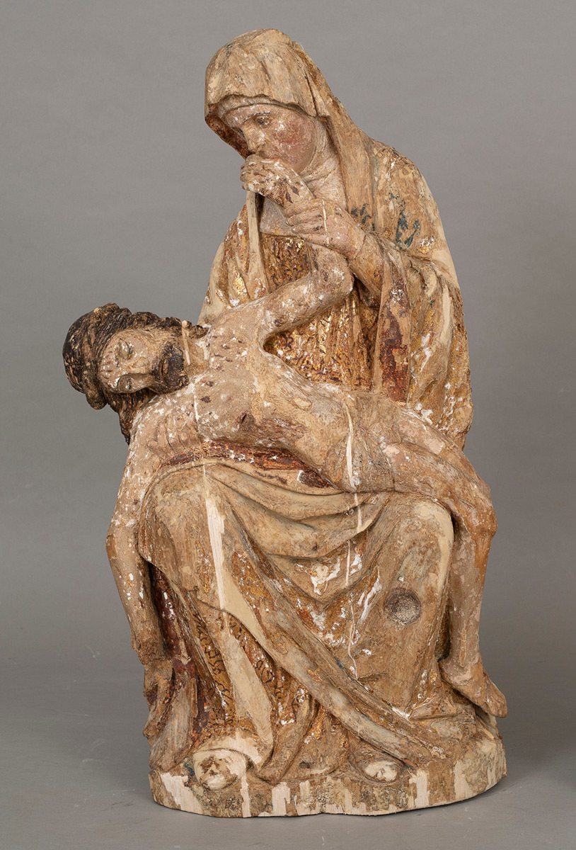 Drvena polikromirana skulptura Pietà datirana je u 15. stoljeće, ali su njezin izvorni smještaj i porijeklo i dalje nepoznanica, iako kulturne i trgovačke veze Raba, kao i karakteristike skulpture upućuju na venecijanske radionice. Pietà kao jedna od najpopularnijih kršćanskih tema potvrda je promjene duhovne klime u Europi oko 1300. godine, kad se istražuje ljudskost božanstva, Krista kao djeteta, sina ili običnog smrtnika. Prvi primjeri te teme pojavljuju se na području rijeke Rajne, odakle se šire po drugim krajevima Njemačke, Flandrije i Francuske, ali i bliže nama, do Slovenije, Istre, Venecije i Italije, gdje taj medijevalni ikonografski motiv tijekom renesanse doseže vrhunac u plastici.