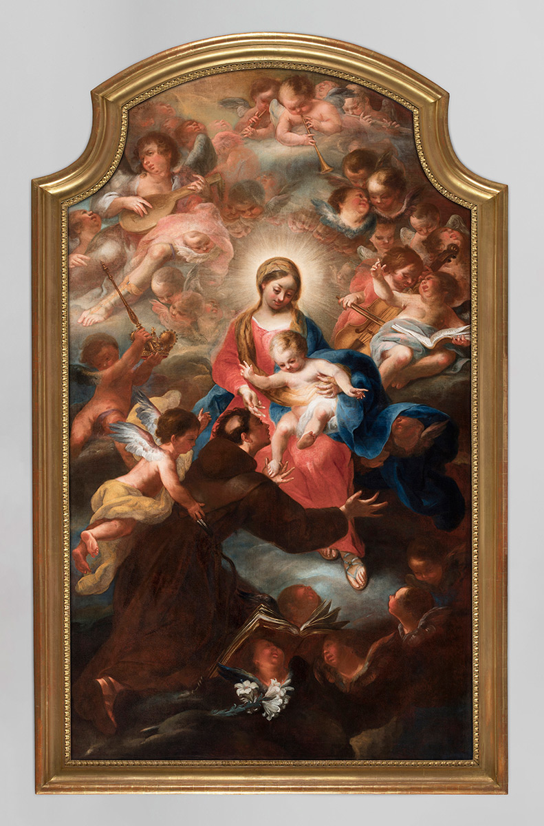 U središte kompozicije smještena je Bogorodica s Djetetom u naručju, lebdeći na oblacima. Obasjana je zrakama svjetla, a jedan od brojnih anđela koji je okružuju dodaje joj žezlo i krunu. Ispod nje kleči sv. Antun Padovanski u franjevačkom habitu, raširenih ruku, obraćajući joj se naglašenom gestom, u vjerskom zanosu. Središnja scena uokvirena je razigranim likovima anđela svirača u gornjoj i anđeoskim glavicama u donjoj zoni. U prvom planu je otvorena knjiga i bijeli ljiljan, svečevi atributi.
