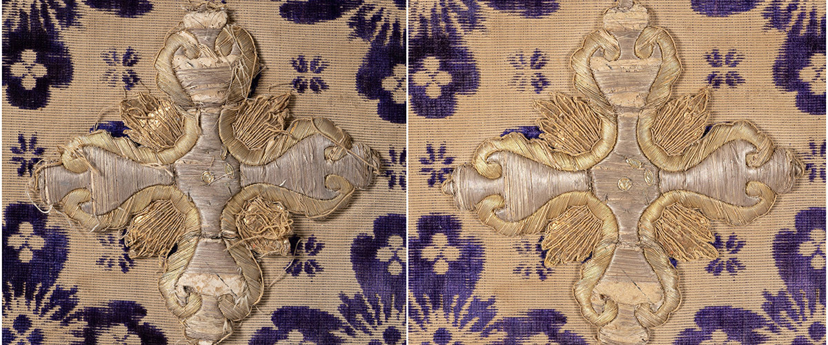 Na predmetima su 2024. godine izvedeni cjeloviti konzervatorsko-restauratorski radovi (voditeljica: Sandra Lucić Vujičić, Odjel za tekstil, papir i kožu, Služba za pokretnu baštinu) koji su počeli konzervatorsko-restauratorskim istraživanjima, odnosno fotografskim dokumentiranjem stanja predmeta, izradom grafičke dokumentacije te kemijskim, tehničkim i povijesnoumjetničkim analizama. Analizirani su svi slojevi stihara i orara. Zatim su uklonjeni svi neprimjereni materijali iz prethodnih intervencija te su odvojene podstavne tkanine. Svi dijelovi predmeta očišćeni su suhim postupkom, vosak kemijskim postupkom, a podstavne tkanine i mokrim postupkom, u kupelji neionskog deterdženta, nakon čega su izravnate i osušene pod staklenim utezima na sobnoj temperaturi. Sva zatečena oštećenja na predmetima sanirana su podlaganjem i šivanjem svilenim i pamučnim koncima, a najsloženije je bilo konzerviranje stanja vezenih križeva i široke pozlaćene trake. Izveden je minimalni retuš papirnatih podloga veza, čime je ublažena bjelina papira te ujednačena s lokalnim tonom. Nadomješteni su nedostajući konstruktivni i funkcionalni dijelovi predmeta te su nabavljena, izvornima vrlo slična, manja puceta za bočne izreze stihara te jedno veće puce za kopčanje orara na stihar. Dijelovi predmeta spojeni su u cjelinu, a predmeti pohranjeni u kutiju od beskiselinske ljepenke te vraćeni vlasniku u ožujku 2025. godine.