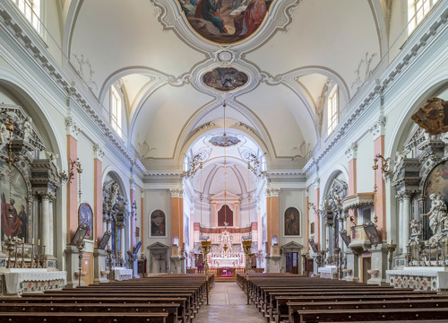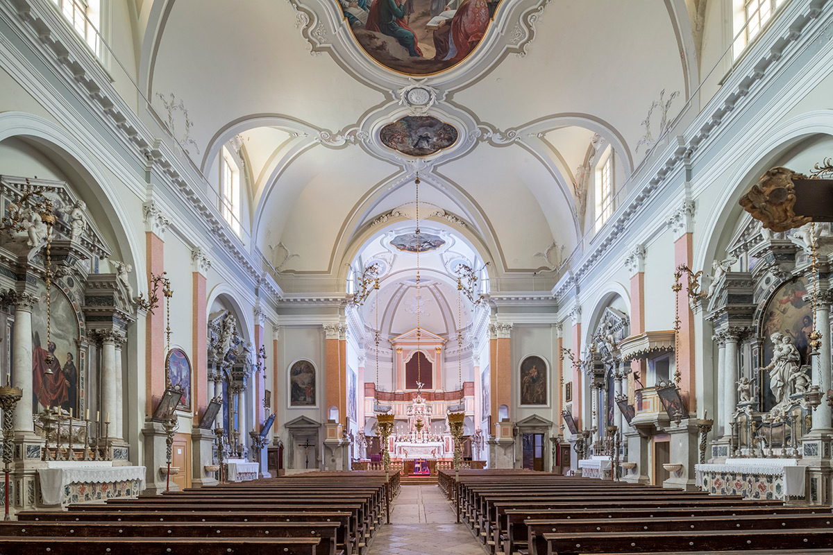 Postojeća crkva sv. Antuna opata posvećena je 1774. godine, a orijentirana je u smjeru sjever – jug. Crkva je jednobrodna s dubokim svetištem zaključenim polukružnom apsidom u kojoj je konzolno istaknuto pjevalište. Crkveni zidovi su raščlanjeni parovima pilastara velikoga reda, o koje se oslanja bogato profiliran istaknuti vijenac. Veliki svod nad lađom ukrašen je zidnim slikama s dekorativnim štukookvirima, dok je u sredini svoda svetišta slika na platnu autora Francesca Maggiota, uokvirena reljefnom štukodekoracijom koju je izveo Clemente Somazzi.