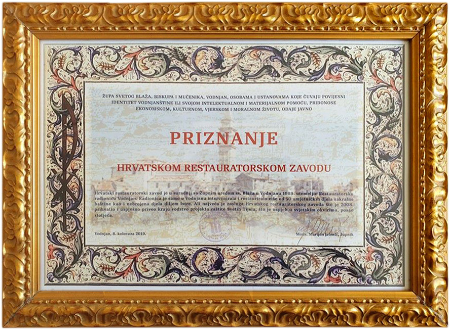 Hrvatski restauratorski zavod primio je priznanje Župe sv. Blaža biskupa i mučenika iz Vodnjana za „… čuvanje povijesnog identiteta Vodnjanštine i doprinos ekonomskom, kulturnom, vjerskom i moralnom životu župe.“ Priznanje je ravnateljici dr. sc. Tajani Pleše uručio župnik mons. Marijan Jelenić 9. kolovoza 2019. godine u sklopu obilježavanja 30. obljetnice Restauratorske radionice Vodnjan-Juršići.