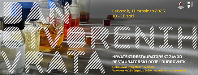 Pozivamo vas na Dan otvorenih vrata Hrvatskog restauratorskog zavoda u četvrtak, 11. prosinca 2025. godine, od 10 do 18 sati, na lokacijama ljetnikovac Stay, Batahovina bb i Vukovarska ulica 16a u Dubrovniku.