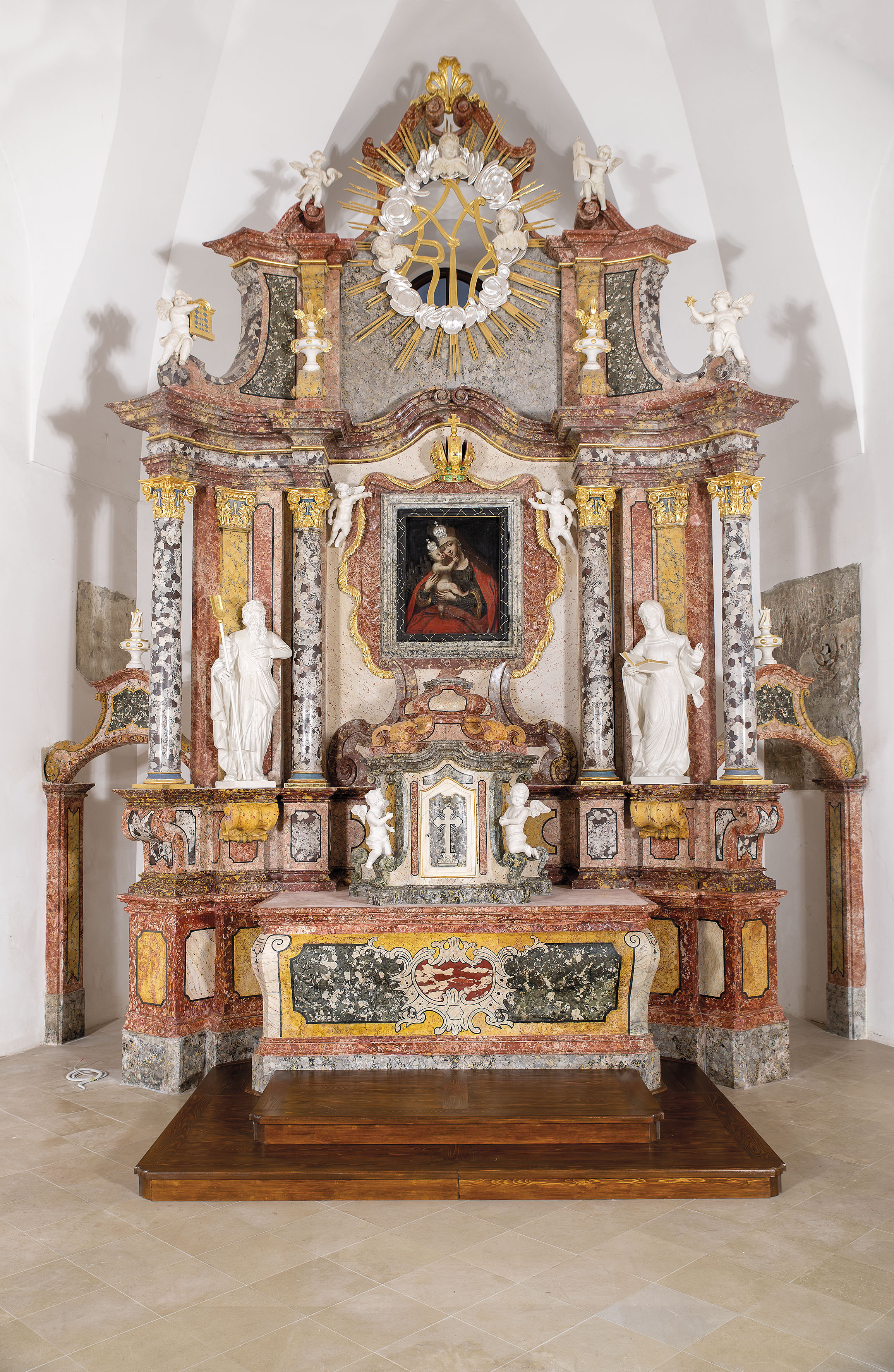 Oltar je izrađen specifičnom tehnikom kojom se smjesama gipsa, različitih pigmenata i tutkalne vode oponašaju različite vrste mramora.